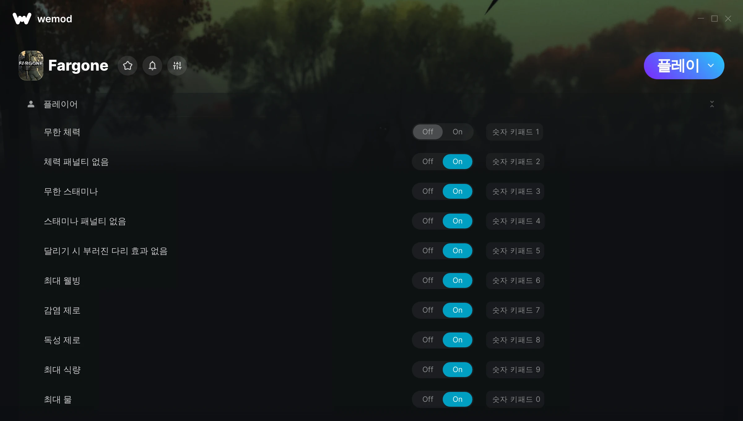 Fargone에서 치트를 사용하려면 어떻게 해야 하나요?WeMod는 PC의 모든 게임을 표시합니다. 목록에서 게임을 선택하고 플레이를 누르세요. 게임을 시작하면 다양한 치트를 활성화할 수 있습니다!모드가 제 게임 버전과 호환될까요?WeMod는 고급 기술로 실행 중인 게임 버전을 탐지하고 모드 지원 여부를 표시합니다. 모드가 지원되지 않는다면 모드를 테스트해보거나 업데이트를 요청할 수 있습니다!