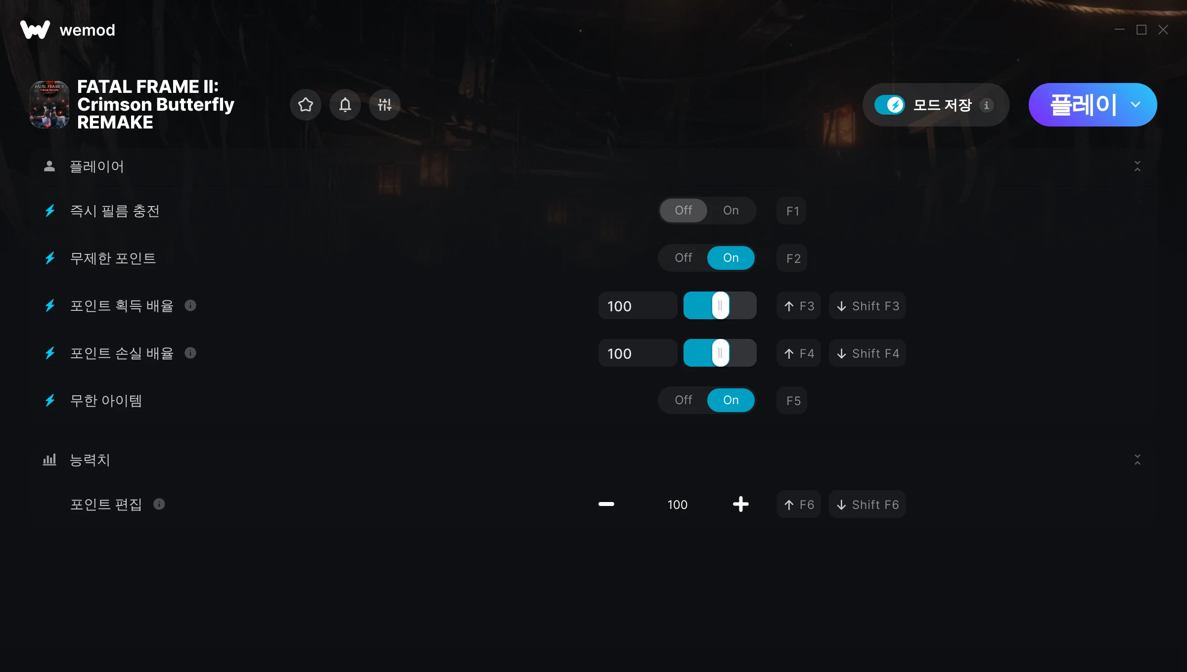 FATAL FRAME II: Crimson Butterfly REMAKE에서 치트를 사용하려면 어떻게 해야 하나요?WeMod는 PC의 모든 게임을 표시합니다. 목록에서 게임을 선택하고 플레이를 누르세요. 게임을 시작하면 다양한 치트를 활성화할 수 있습니다!모드가 제 게임 버전과 호환될까요?WeMod는 고급 기술로 실행 중인 게임 버전을 탐지하고 모드 지원 여부를 표시합니다. 모드가 지원되지 않는다면 모드를 테스트해보거나 업데이트를 요청할 수 있습니다!