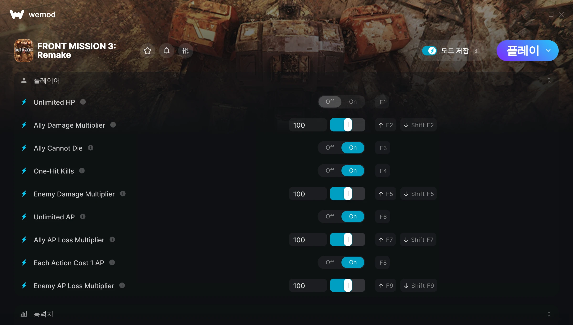 켜짐 꺼짐 무제한 체력 무제한 스태미너 모드 전환