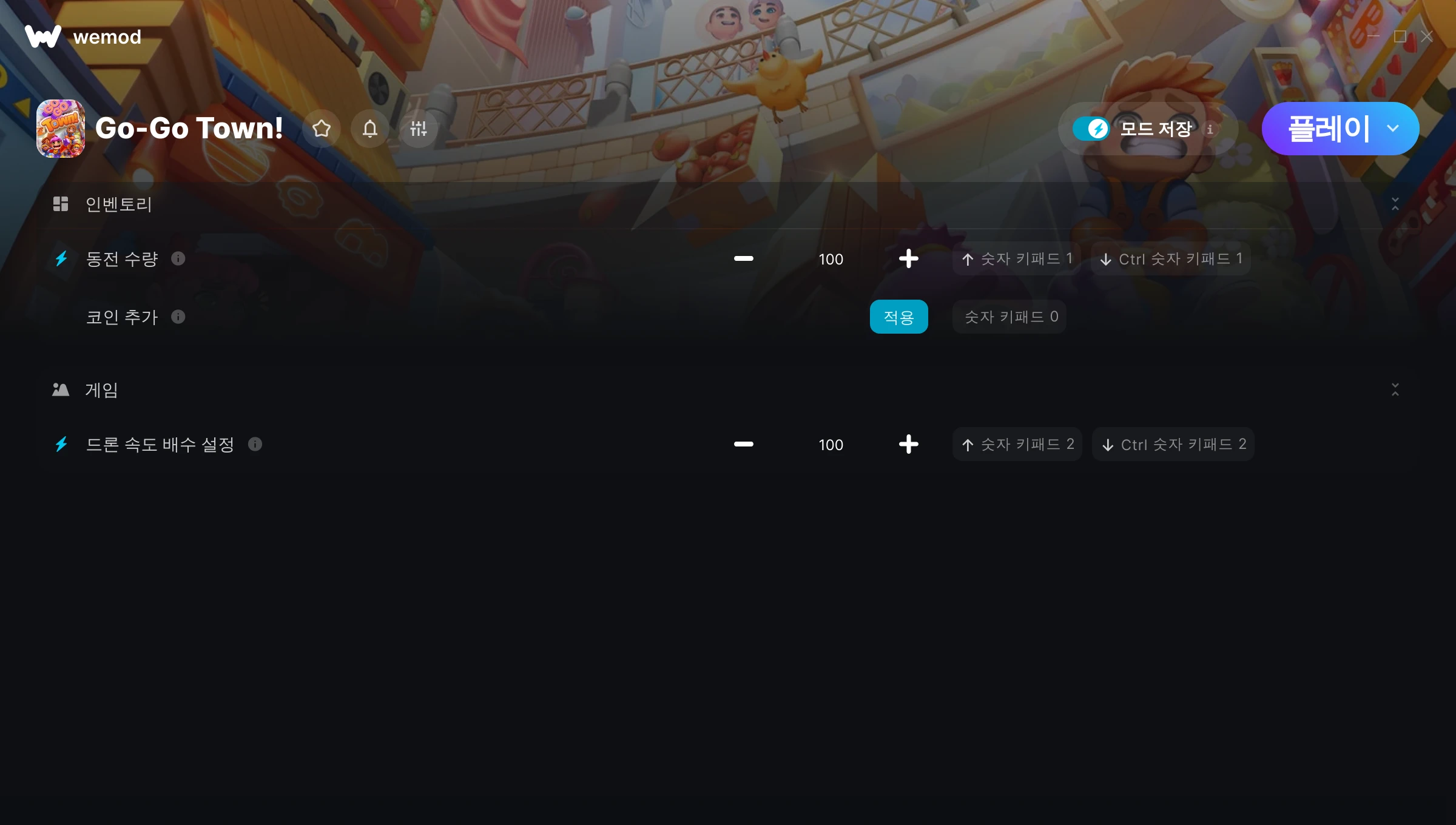 Go-Go Town!에서 치트를 사용하려면 어떻게 해야 하나요?WeMod는 PC의 모든 게임을 표시합니다. 목록에서 게임을 선택하고 플레이를 누르세요. 게임을 시작하면 다양한 치트를 활성화할 수 있습니다!모드가 제 게임 버전과 호환될까요?WeMod는 고급 기술로 실행 중인 게임 버전을 탐지하고 모드 지원 여부를 표시합니다. 모드가 지원되지 않는다면 모드를 테스트해보거나 업데이트를 요청할 수 있습니다!