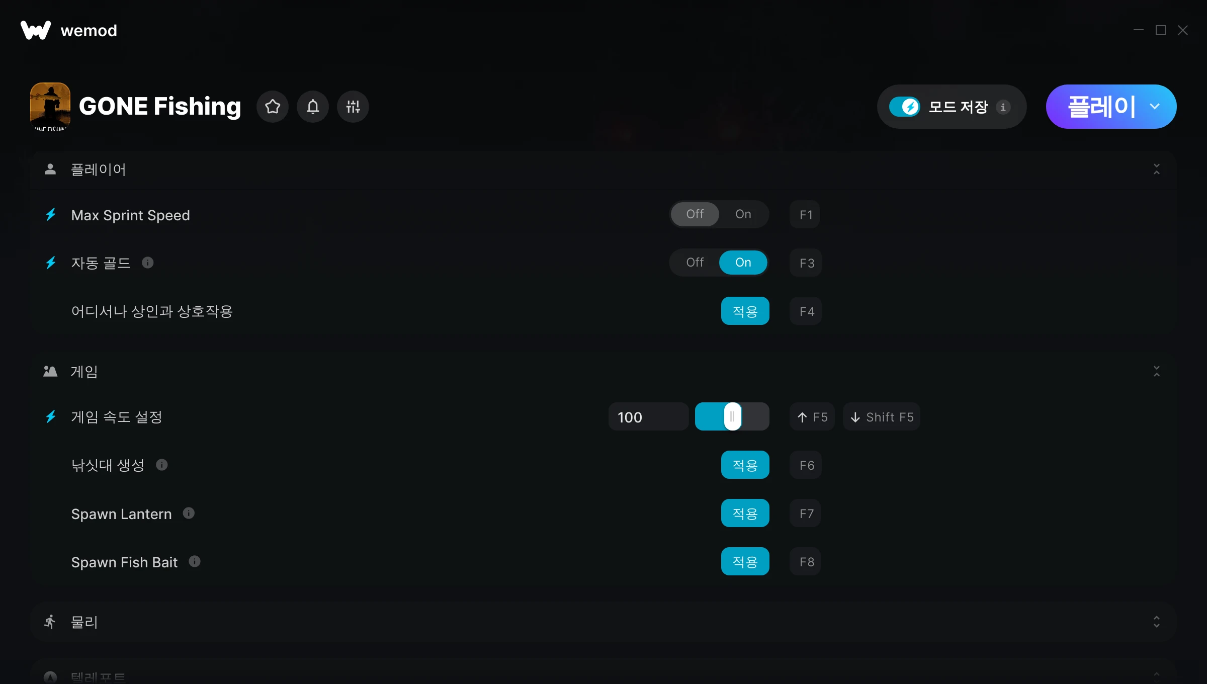GONE Fishing에서 치트를 사용하려면 어떻게 해야 하나요?WeMod는 PC의 모든 게임을 표시합니다. 목록에서 게임을 선택하고 플레이를 누르세요. 게임을 시작하면 다양한 치트를 활성화할 수 있습니다!모드가 제 게임 버전과 호환될까요?WeMod는 고급 기술로 실행 중인 게임 버전을 탐지하고 모드 지원 여부를 표시합니다. 모드가 지원되지 않는다면 모드를 테스트해보거나 업데이트를 요청할 수 있습니다!