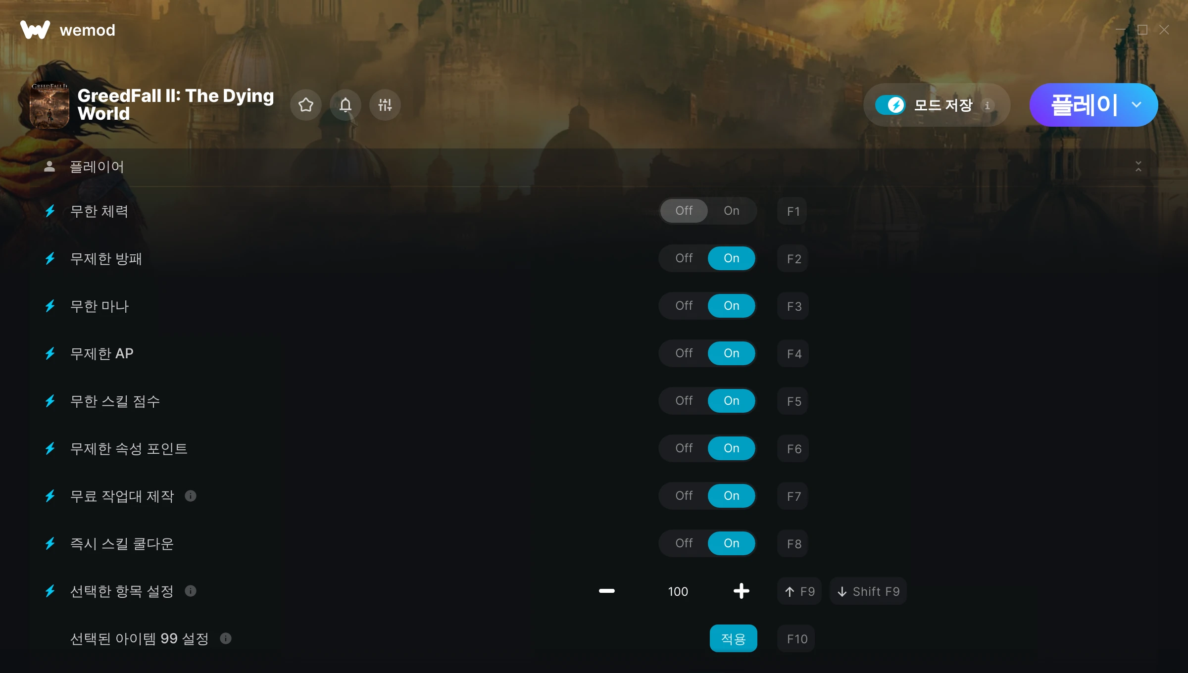 GreedFall II: The Dying World에서 치트를 사용하려면 어떻게 해야 하나요?WeMod는 PC의 모든 게임을 표시합니다. 목록에서 게임을 선택하고 플레이를 누르세요. 게임을 시작하면 다양한 치트를 활성화할 수 있습니다!모드가 제 게임 버전과 호환될까요?WeMod는 고급 기술로 실행 중인 게임 버전을 탐지하고 모드 지원 여부를 표시합니다. 모드가 지원되지 않는다면 모드를 테스트해보거나 업데이트를 요청할 수 있습니다!