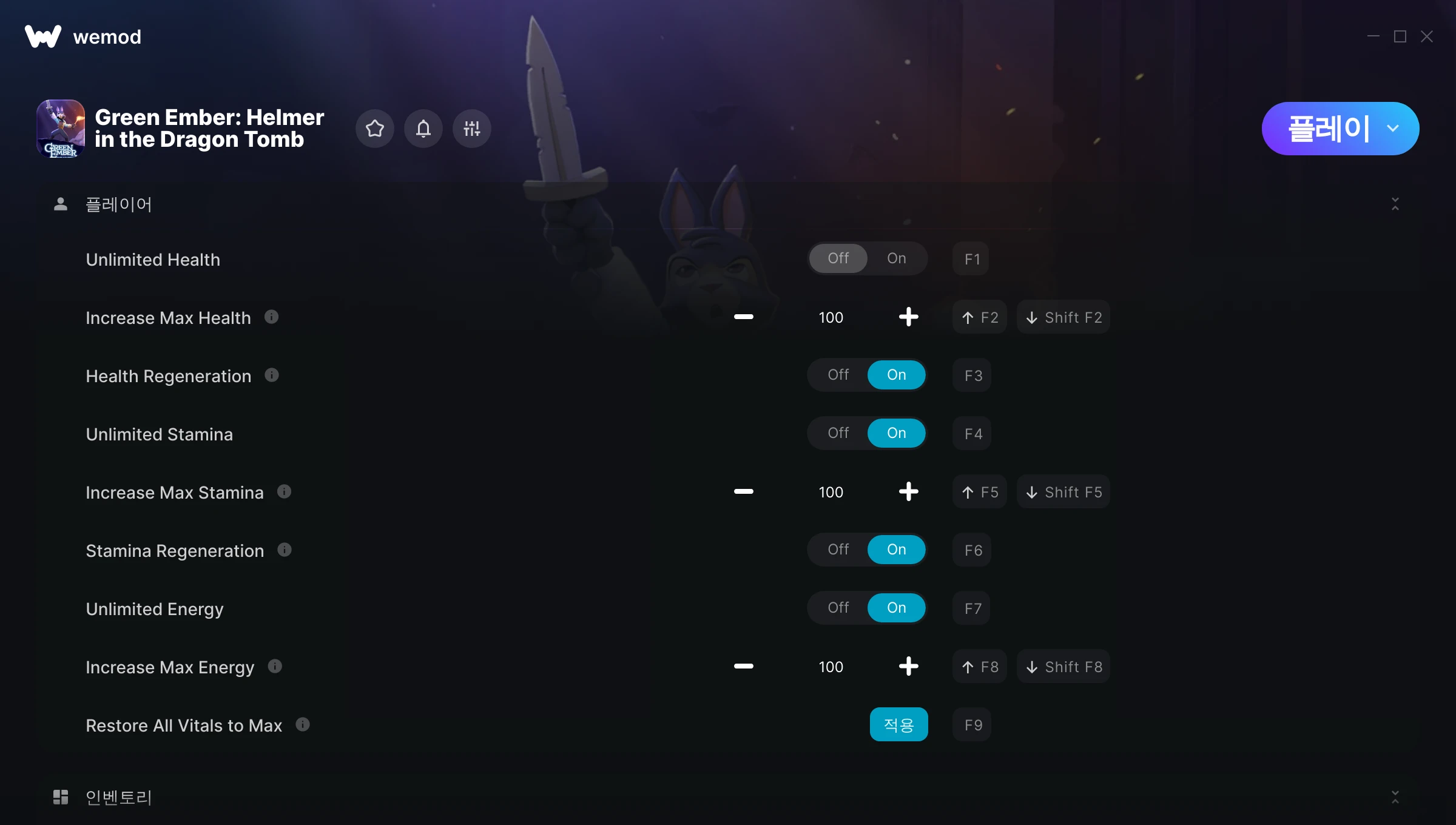 Green Ember: Helmer in the Dragon Tomb에서 치트를 사용하려면 어떻게 해야 하나요?WeMod는 PC의 모든 게임을 표시합니다. 목록에서 게임을 선택하고 플레이를 누르세요. 게임을 시작하면 다양한 치트를 활성화할 수 있습니다!모드가 제 게임 버전과 호환될까요?WeMod는 고급 기술로 실행 중인 게임 버전을 탐지하고 모드 지원 여부를 표시합니다. 모드가 지원되지 않는다면 모드를 테스트해보거나 업데이트를 요청할 수 있습니다!