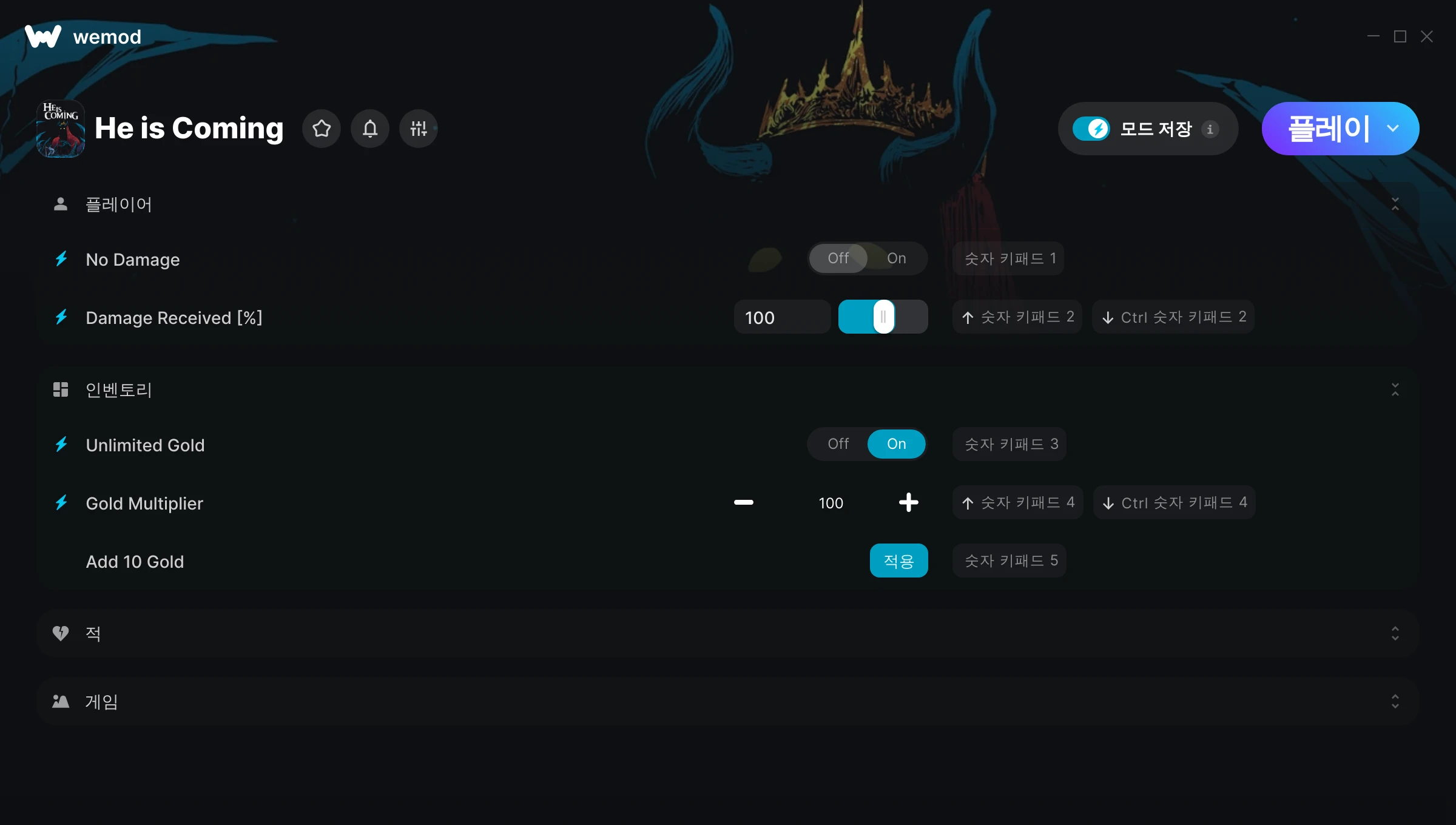 He is Coming에서 치트를 사용하려면 어떻게 해야 하나요?WeMod는 PC의 모든 게임을 표시합니다. 목록에서 게임을 선택하고 플레이를 누르세요. 게임을 시작하면 다양한 치트를 활성화할 수 있습니다!모드가 제 게임 버전과 호환될까요?WeMod는 고급 기술로 실행 중인 게임 버전을 탐지하고 모드 지원 여부를 표시합니다. 모드가 지원되지 않는다면 모드를 테스트해보거나 업데이트를 요청할 수 있습니다!