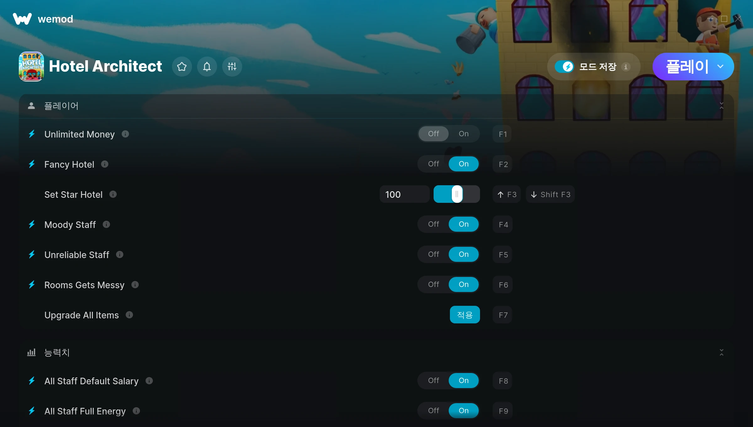 Hotel Architect에서 치트를 사용하려면 어떻게 해야 하나요?WeMod는 PC의 모든 게임을 표시합니다. 목록에서 게임을 선택하고 플레이를 누르세요. 게임을 시작하면 다양한 치트를 활성화할 수 있습니다!모드가 제 게임 버전과 호환될까요?WeMod는 고급 기술로 실행 중인 게임 버전을 탐지하고 모드 지원 여부를 표시합니다. 모드가 지원되지 않는다면 모드를 테스트해보거나 업데이트를 요청할 수 있습니다!