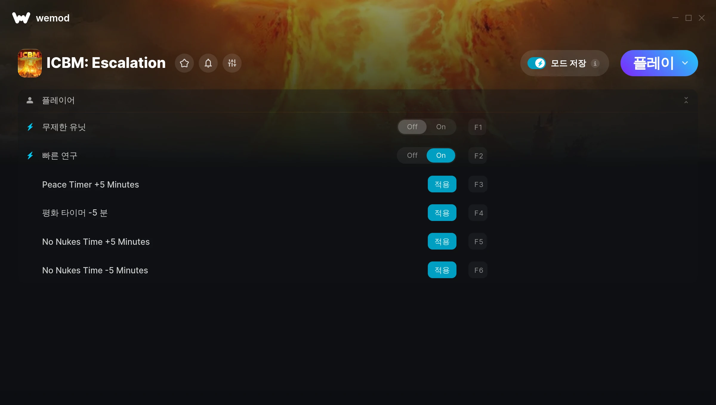 ICBM: Escalation에서 치트를 사용하려면 어떻게 해야 하나요?WeMod는 PC의 모든 게임을 표시합니다. 목록에서 게임을 선택하고 플레이를 누르세요. 게임을 시작하면 다양한 치트를 활성화할 수 있습니다!모드가 제 게임 버전과 호환될까요?WeMod는 고급 기술로 실행 중인 게임 버전을 탐지하고 모드 지원 여부를 표시합니다. 모드가 지원되지 않는다면 모드를 테스트해보거나 업데이트를 요청할 수 있습니다!