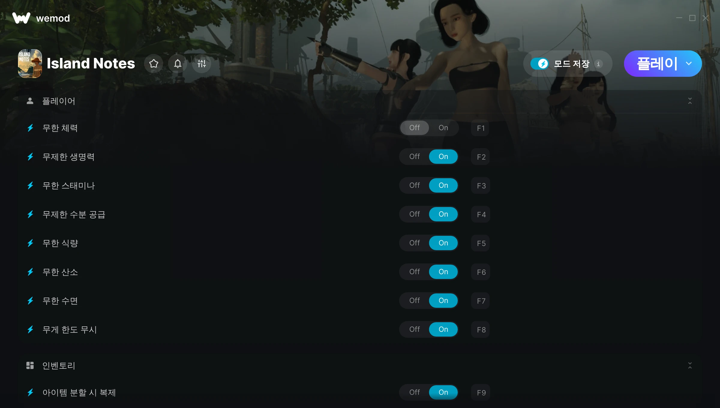 Island Notes에서 치트를 사용하려면 어떻게 해야 하나요?WeMod는 PC의 모든 게임을 표시합니다. 목록에서 게임을 선택하고 플레이를 누르세요. 게임을 시작하면 다양한 치트를 활성화할 수 있습니다!모드가 제 게임 버전과 호환될까요?WeMod는 고급 기술로 실행 중인 게임 버전을 탐지하고 모드 지원 여부를 표시합니다. 모드가 지원되지 않는다면 모드를 테스트해보거나 업데이트를 요청할 수 있습니다!