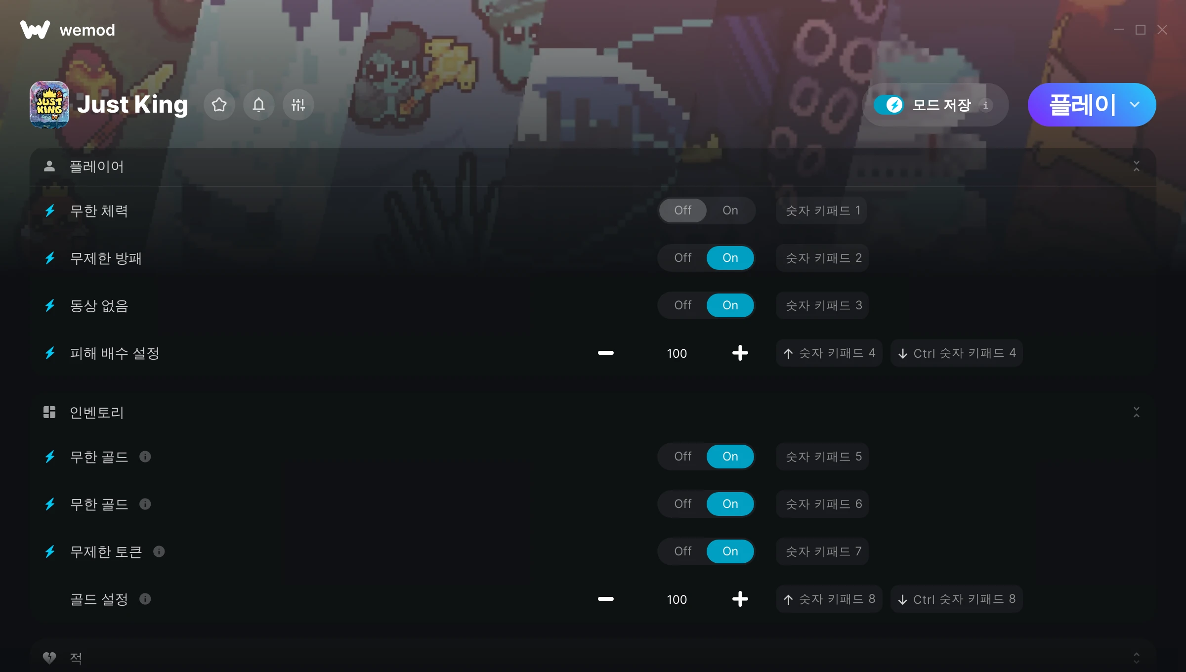 Just King에서 치트를 사용하려면 어떻게 해야 하나요?WeMod는 PC의 모든 게임을 표시합니다. 목록에서 게임을 선택하고 플레이를 누르세요. 게임을 시작하면 다양한 치트를 활성화할 수 있습니다!모드가 제 게임 버전과 호환될까요?WeMod는 고급 기술로 실행 중인 게임 버전을 탐지하고 모드 지원 여부를 표시합니다. 모드가 지원되지 않는다면 모드를 테스트해보거나 업데이트를 요청할 수 있습니다!