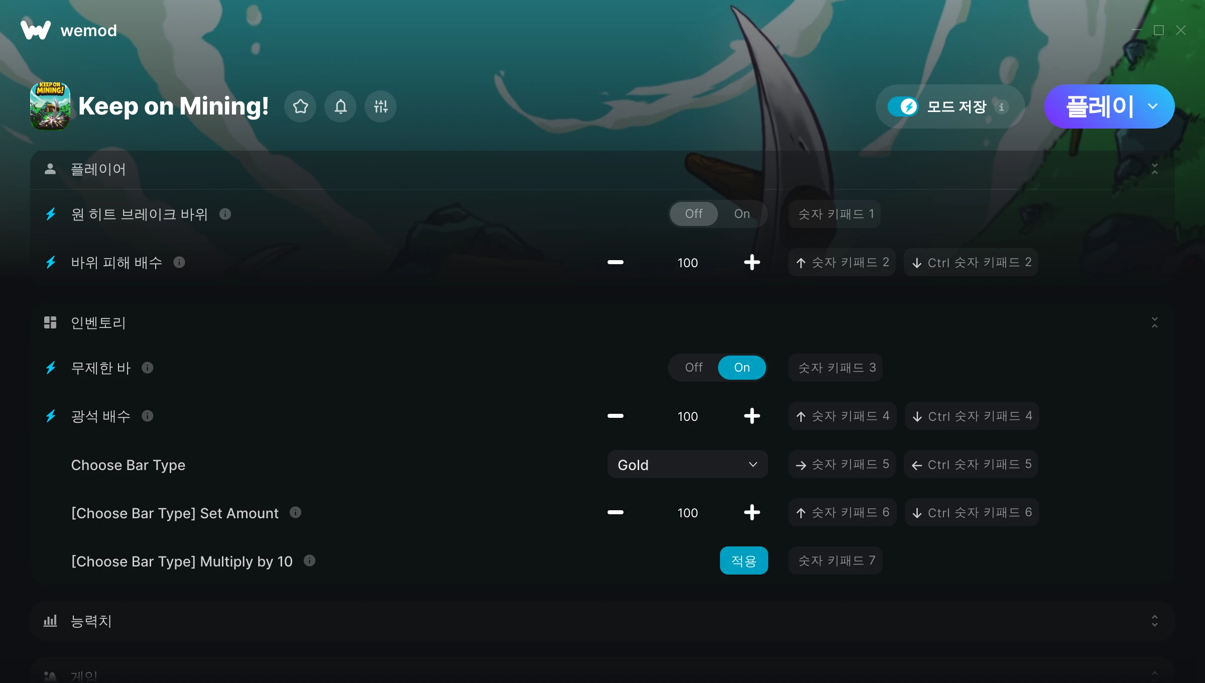 Keep on Mining!에서 치트를 사용하려면 어떻게 해야 하나요?WeMod는 PC의 모든 게임을 표시합니다. 목록에서 게임을 선택하고 플레이를 누르세요. 게임을 시작하면 다양한 치트를 활성화할 수 있습니다!모드가 제 게임 버전과 호환될까요?WeMod는 고급 기술로 실행 중인 게임 버전을 탐지하고 모드 지원 여부를 표시합니다. 모드가 지원되지 않는다면 모드를 테스트해보거나 업데이트를 요청할 수 있습니다!