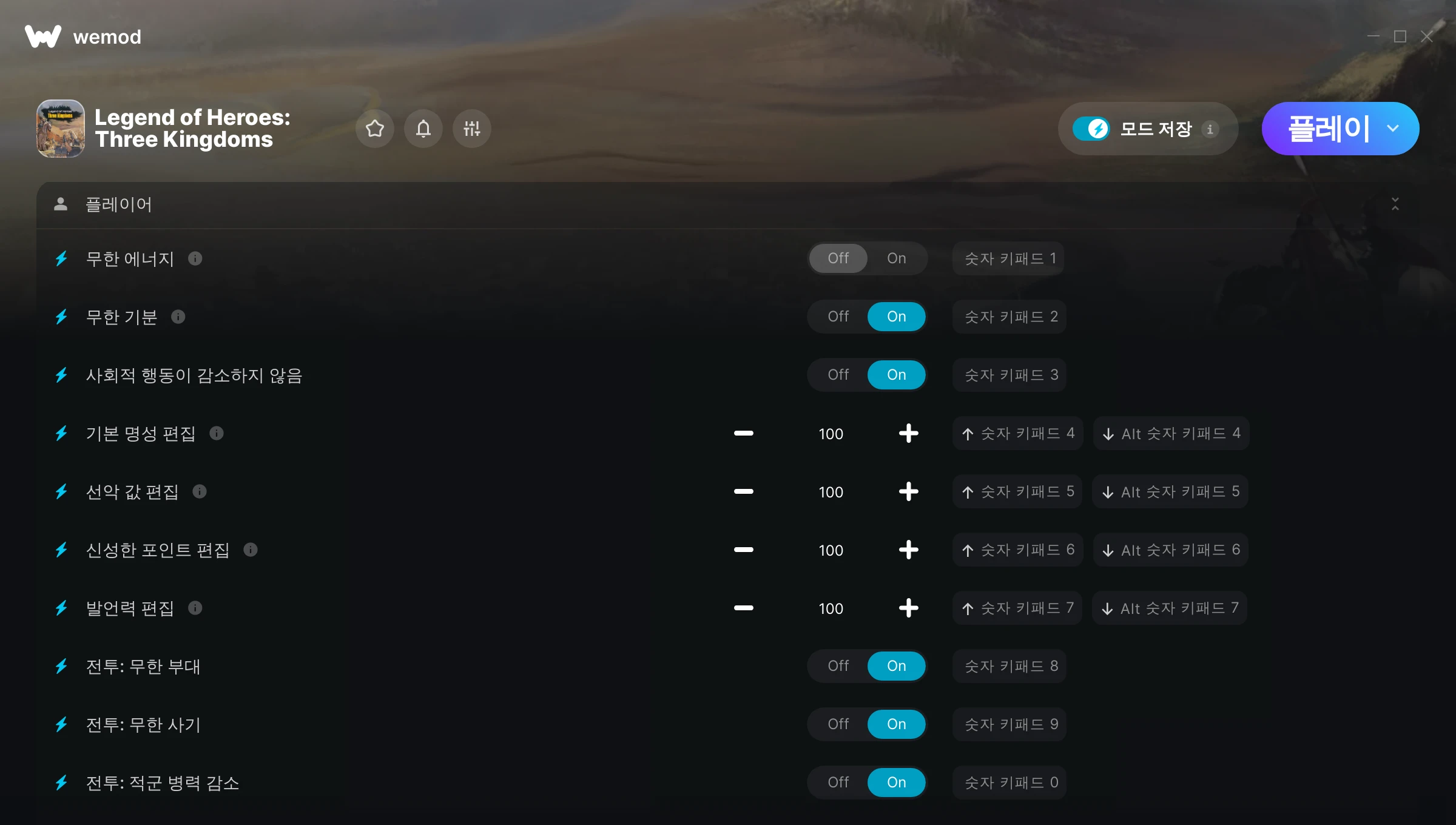 Legend of Heroes: Three Kingdoms에서 치트를 사용하려면 어떻게 해야 하나요?WeMod는 PC의 모든 게임을 표시합니다. 목록에서 게임을 선택하고 플레이를 누르세요. 게임을 시작하면 다양한 치트를 활성화할 수 있습니다!모드가 제 게임 버전과 호환될까요?WeMod는 고급 기술로 실행 중인 게임 버전을 탐지하고 모드 지원 여부를 표시합니다. 모드가 지원되지 않는다면 모드를 테스트해보거나 업데이트를 요청할 수 있습니다!