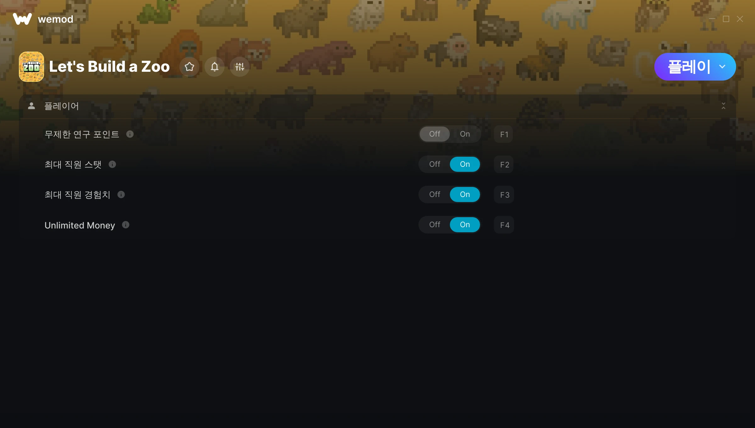 Let's Build a Zoo에서 치트를 사용하려면 어떻게 해야 하나요?WeMod는 PC의 모든 게임을 표시합니다. 목록에서 게임을 선택하고 플레이를 누르세요. 게임을 시작하면 다양한 치트를 활성화할 수 있습니다!모드가 제 게임 버전과 호환될까요?WeMod는 고급 기술로 실행 중인 게임 버전을 탐지하고 모드 지원 여부를 표시합니다. 모드가 지원되지 않는다면 모드를 테스트해보거나 업데이트를 요청할 수 있습니다!