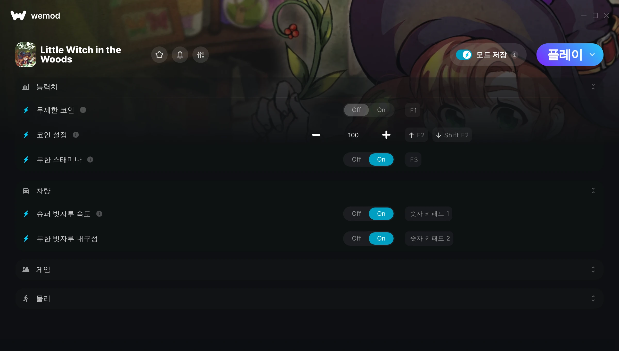 Little Witch in the Woods에서 치트를 사용하려면 어떻게 해야 하나요?WeMod는 PC의 모든 게임을 표시합니다. 목록에서 게임을 선택하고 플레이를 누르세요. 게임을 시작하면 다양한 치트를 활성화할 수 있습니다!모드가 제 게임 버전과 호환될까요?WeMod는 고급 기술로 실행 중인 게임 버전을 탐지하고 모드 지원 여부를 표시합니다. 모드가 지원되지 않는다면 모드를 테스트해보거나 업데이트를 요청할 수 있습니다!