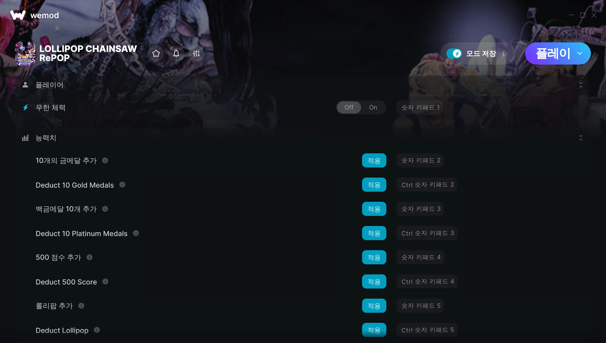 LOLLIPOP CHAINSAW RePOP에서 치트를 사용하려면 어떻게 해야 하나요?WeMod는 PC의 모든 게임을 표시합니다. 목록에서 게임을 선택하고 플레이를 누르세요. 게임을 시작하면 다양한 치트를 활성화할 수 있습니다!모드가 제 게임 버전과 호환될까요?WeMod는 고급 기술로 실행 중인 게임 버전을 탐지하고 모드 지원 여부를 표시합니다. 모드가 지원되지 않는다면 모드를 테스트해보거나 업데이트를 요청할 수 있습니다!