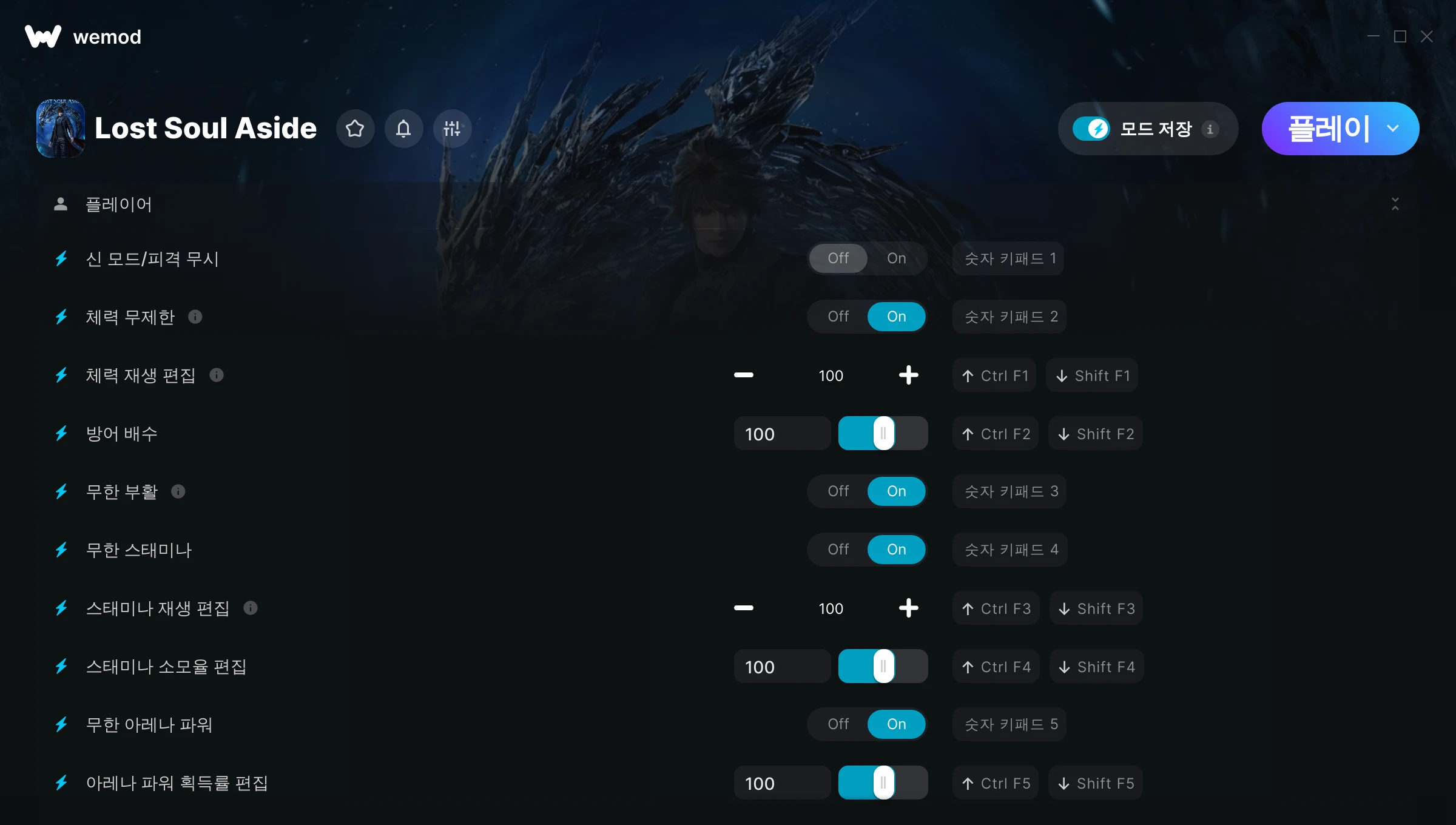 Lost Soul Aside에서 치트를 사용하려면 어떻게 해야 하나요?WeMod는 PC의 모든 게임을 표시합니다. 목록에서 게임을 선택하고 플레이를 누르세요. 게임을 시작하면 다양한 치트를 활성화할 수 있습니다!모드가 제 게임 버전과 호환될까요?WeMod는 고급 기술로 실행 중인 게임 버전을 탐지하고 모드 지원 여부를 표시합니다. 모드가 지원되지 않는다면 모드를 테스트해보거나 업데이트를 요청할 수 있습니다!