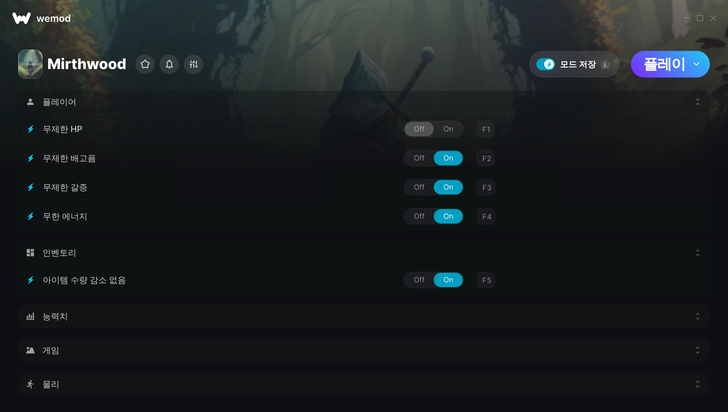 Mirthwood에서 치트를 사용하려면 어떻게 해야 하나요?WeMod는 PC의 모든 게임을 표시합니다. 목록에서 게임을 선택하고 플레이를 누르세요. 게임을 시작하면 다양한 치트를 활성화할 수 있습니다!모드가 제 게임 버전과 호환될까요?WeMod는 고급 기술로 실행 중인 게임 버전을 탐지하고 모드 지원 여부를 표시합니다. 모드가 지원되지 않는다면 모드를 테스트해보거나 업데이트를 요청할 수 있습니다!