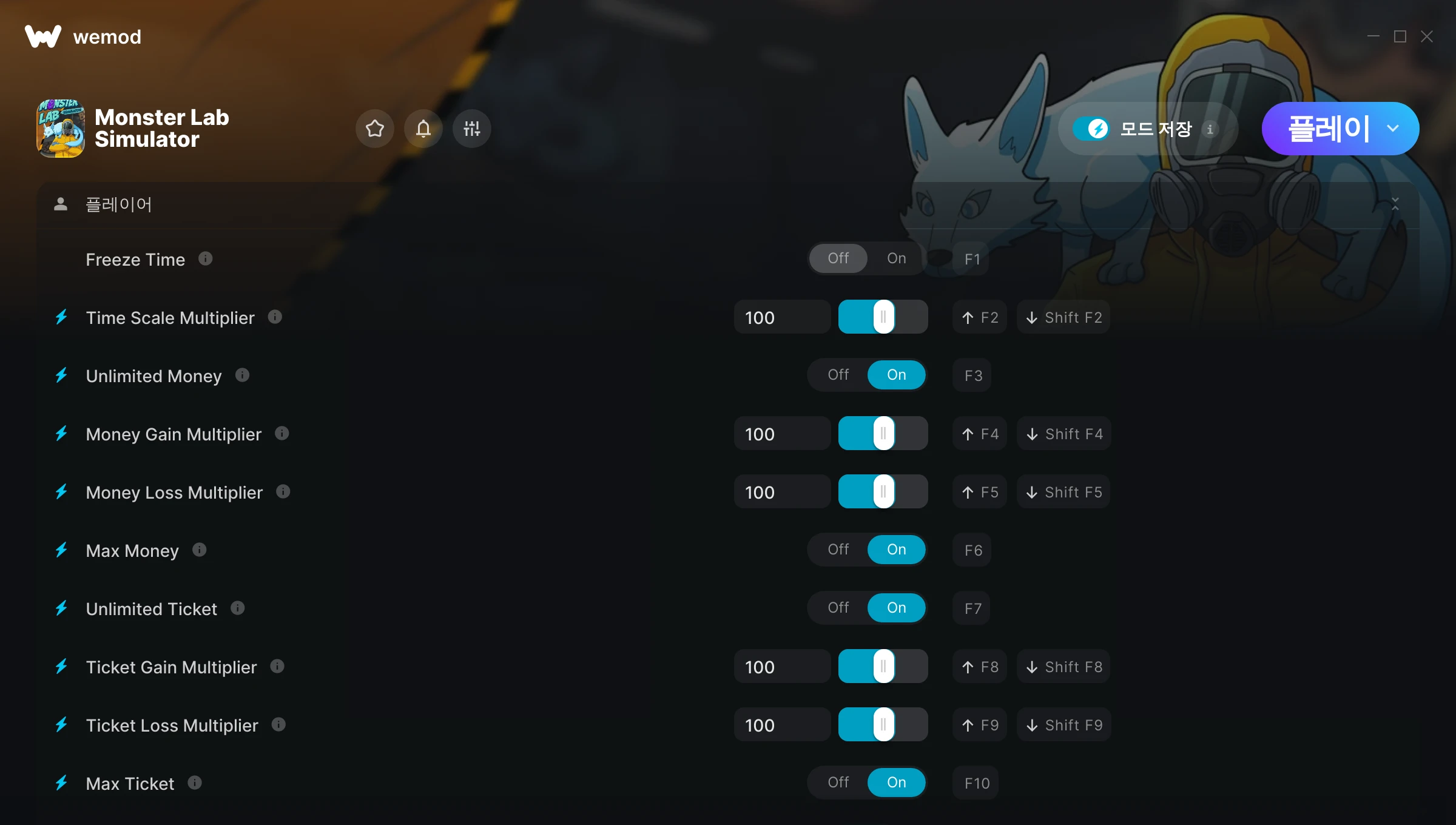 Monster Lab Simulator에서 치트를 사용하려면 어떻게 해야 하나요?WeMod는 PC의 모든 게임을 표시합니다. 목록에서 게임을 선택하고 플레이를 누르세요. 게임을 시작하면 다양한 치트를 활성화할 수 있습니다!모드가 제 게임 버전과 호환될까요?WeMod는 고급 기술로 실행 중인 게임 버전을 탐지하고 모드 지원 여부를 표시합니다. 모드가 지원되지 않는다면 모드를 테스트해보거나 업데이트를 요청할 수 있습니다!