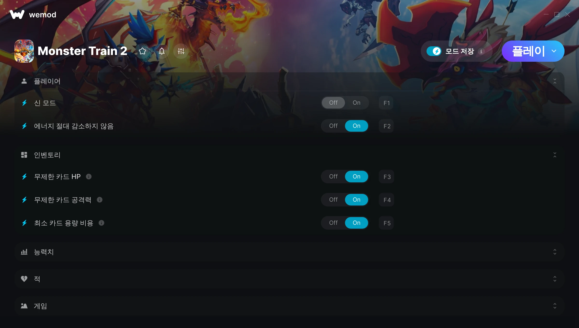 Monster Train 2에서 치트를 사용하려면 어떻게 해야 하나요?WeMod는 PC의 모든 게임을 표시합니다. 목록에서 게임을 선택하고 플레이를 누르세요. 게임을 시작하면 다양한 치트를 활성화할 수 있습니다!모드가 제 게임 버전과 호환될까요?WeMod는 고급 기술로 실행 중인 게임 버전을 탐지하고 모드 지원 여부를 표시합니다. 모드가 지원되지 않는다면 모드를 테스트해보거나 업데이트를 요청할 수 있습니다!