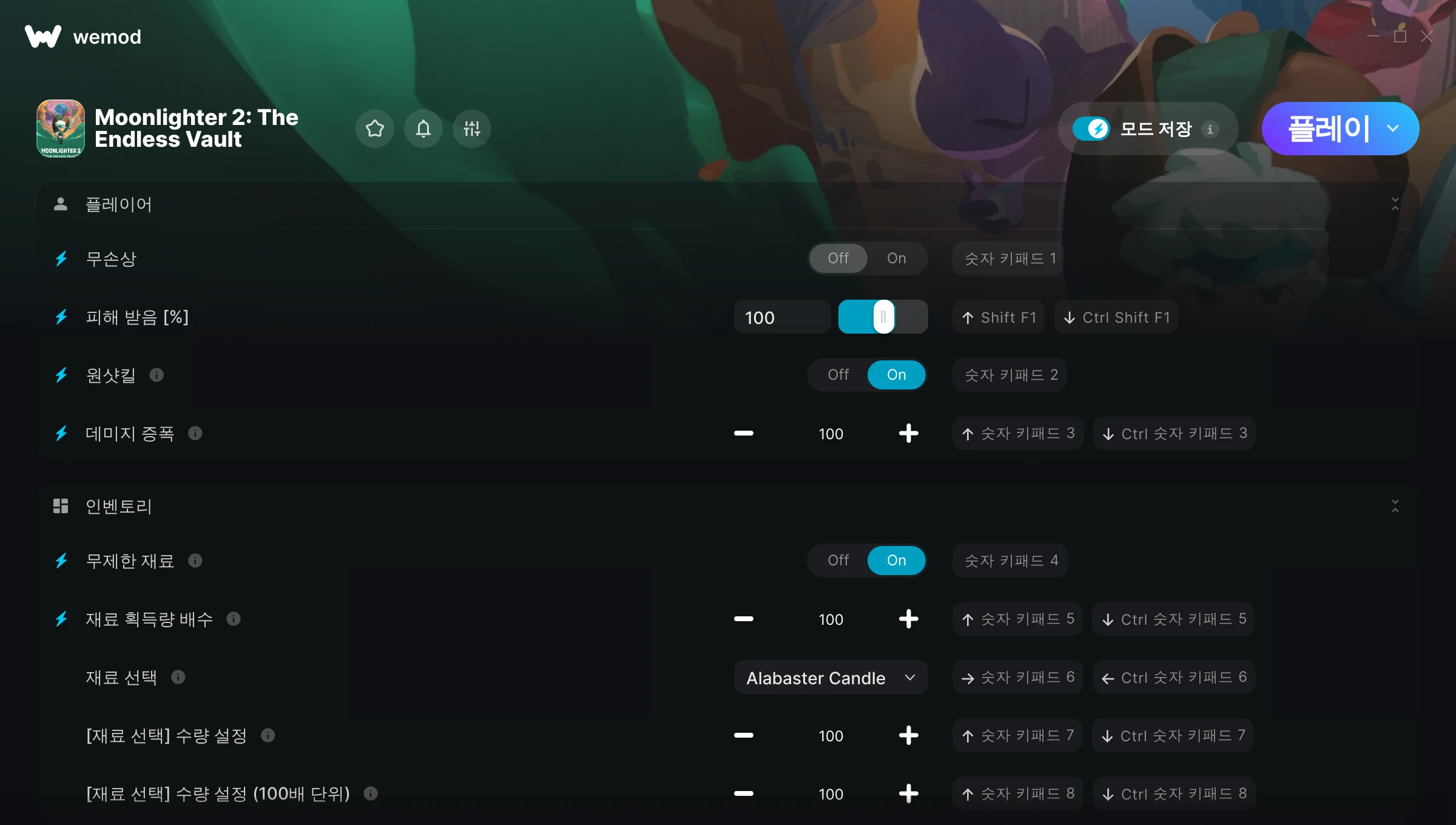 Moonlighter 2: The Endless Vault에서 치트를 사용하려면 어떻게 해야 하나요?WeMod는 PC의 모든 게임을 표시합니다. 목록에서 게임을 선택하고 플레이를 누르세요. 게임을 시작하면 다양한 치트를 활성화할 수 있습니다!모드가 제 게임 버전과 호환될까요?WeMod는 고급 기술로 실행 중인 게임 버전을 탐지하고 모드 지원 여부를 표시합니다. 모드가 지원되지 않는다면 모드를 테스트해보거나 업데이트를 요청할 수 있습니다!