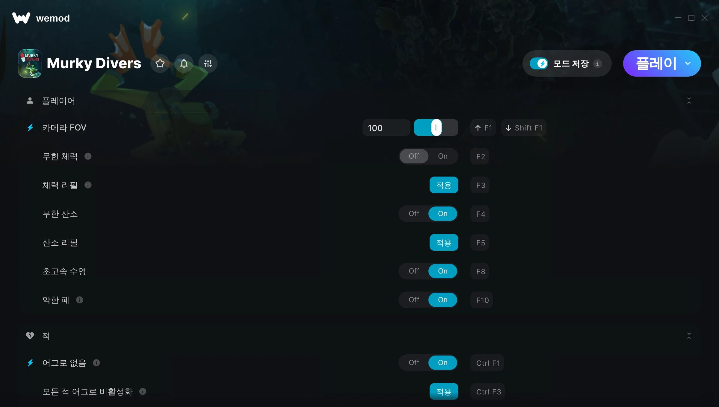 Murky Divers에서 치트를 사용하려면 어떻게 해야 하나요?WeMod는 PC의 모든 게임을 표시합니다. 목록에서 게임을 선택하고 플레이를 누르세요. 게임을 시작하면 다양한 치트를 활성화할 수 있습니다!모드가 제 게임 버전과 호환될까요?WeMod는 고급 기술로 실행 중인 게임 버전을 탐지하고 모드 지원 여부를 표시합니다. 모드가 지원되지 않는다면 모드를 테스트해보거나 업데이트를 요청할 수 있습니다!