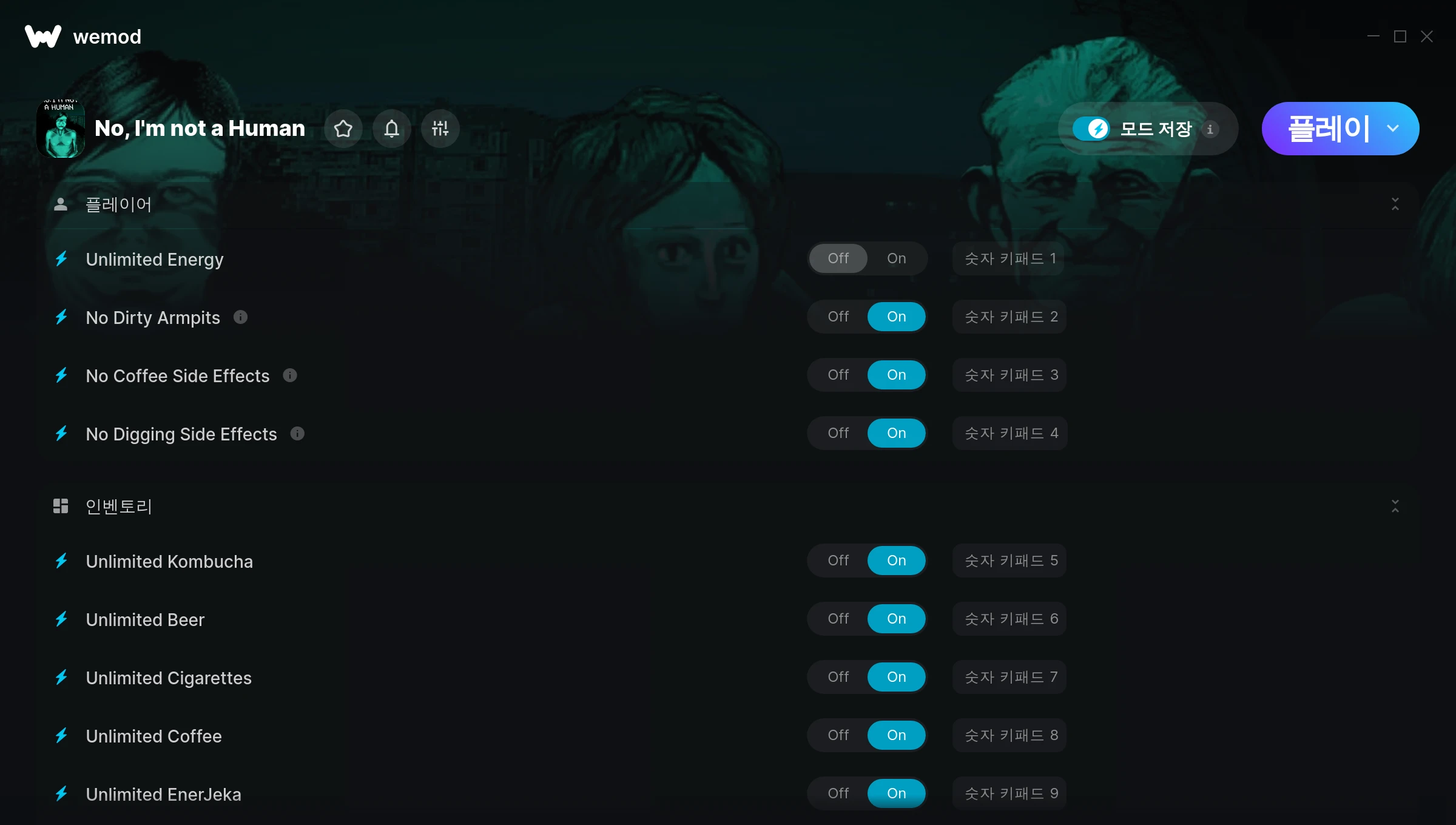 No, I'm not a Human에서 치트를 사용하려면 어떻게 해야 하나요?WeMod는 PC의 모든 게임을 표시합니다. 목록에서 게임을 선택하고 플레이를 누르세요. 게임을 시작하면 다양한 치트를 활성화할 수 있습니다!모드가 제 게임 버전과 호환될까요?WeMod는 고급 기술로 실행 중인 게임 버전을 탐지하고 모드 지원 여부를 표시합니다. 모드가 지원되지 않는다면 모드를 테스트해보거나 업데이트를 요청할 수 있습니다!