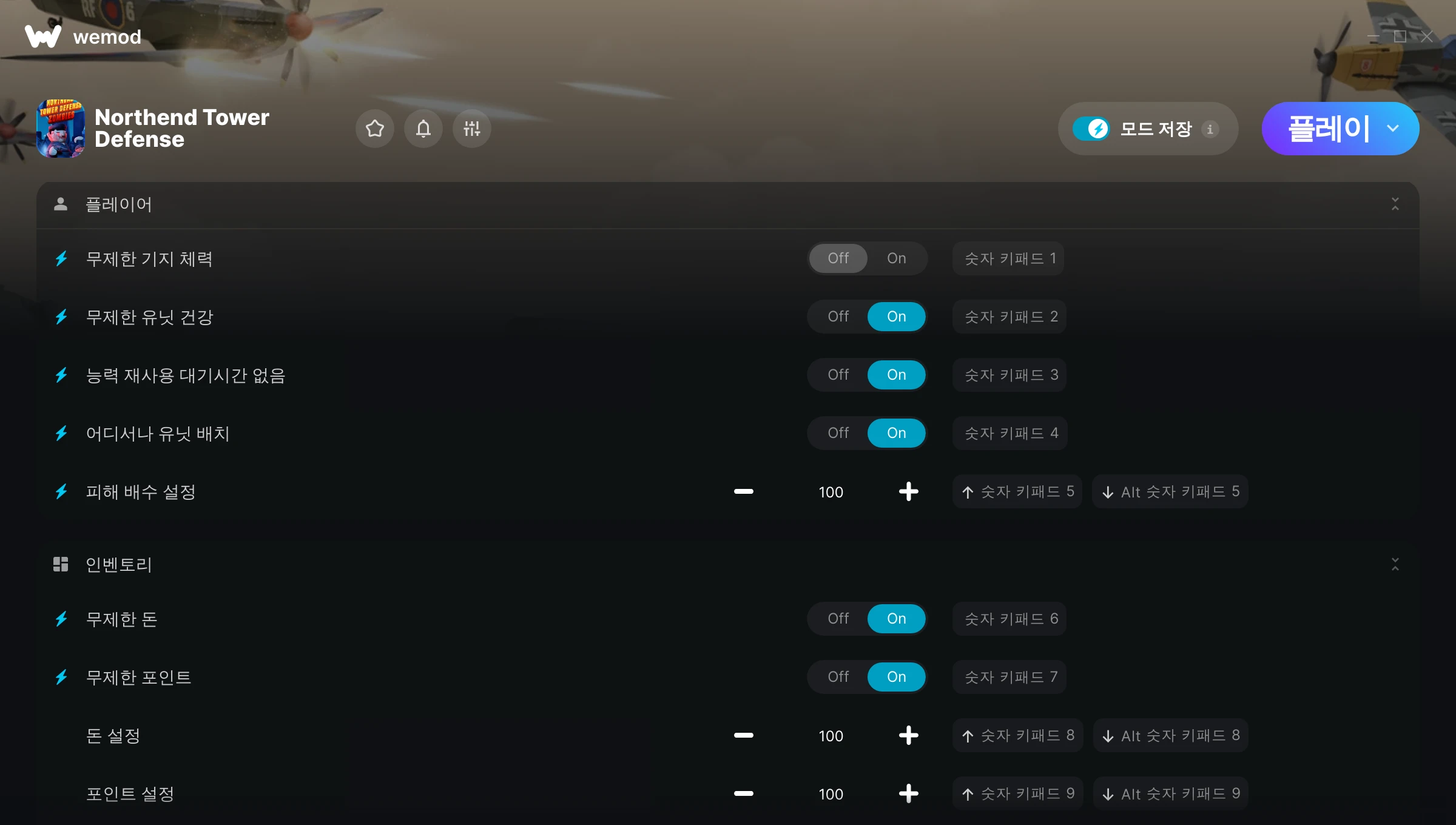 Northend Tower Defense에서 치트를 사용하려면 어떻게 해야 하나요?WeMod는 PC의 모든 게임을 표시합니다. 목록에서 게임을 선택하고 플레이를 누르세요. 게임을 시작하면 다양한 치트를 활성화할 수 있습니다!모드가 제 게임 버전과 호환될까요?WeMod는 고급 기술로 실행 중인 게임 버전을 탐지하고 모드 지원 여부를 표시합니다. 모드가 지원되지 않는다면 모드를 테스트해보거나 업데이트를 요청할 수 있습니다!