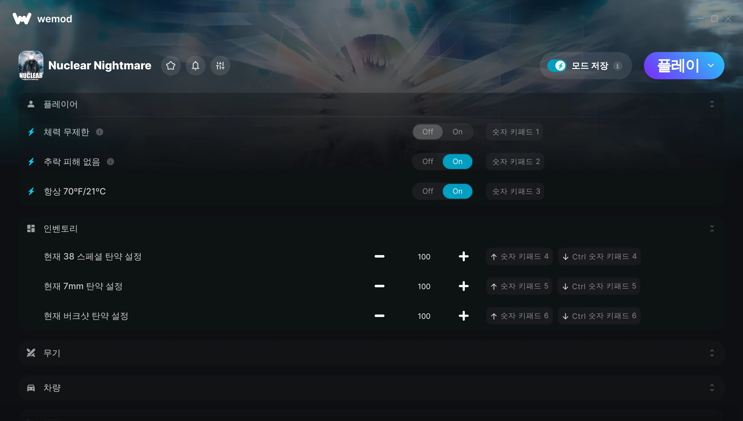 Nuclear Nightmare에서 치트를 사용하려면 어떻게 해야 하나요?WeMod는 PC의 모든 게임을 표시합니다. 목록에서 게임을 선택하고 플레이를 누르세요. 게임을 시작하면 다양한 치트를 활성화할 수 있습니다!모드가 제 게임 버전과 호환될까요?WeMod는 고급 기술로 실행 중인 게임 버전을 탐지하고 모드 지원 여부를 표시합니다. 모드가 지원되지 않는다면 모드를 테스트해보거나 업데이트를 요청할 수 있습니다!
