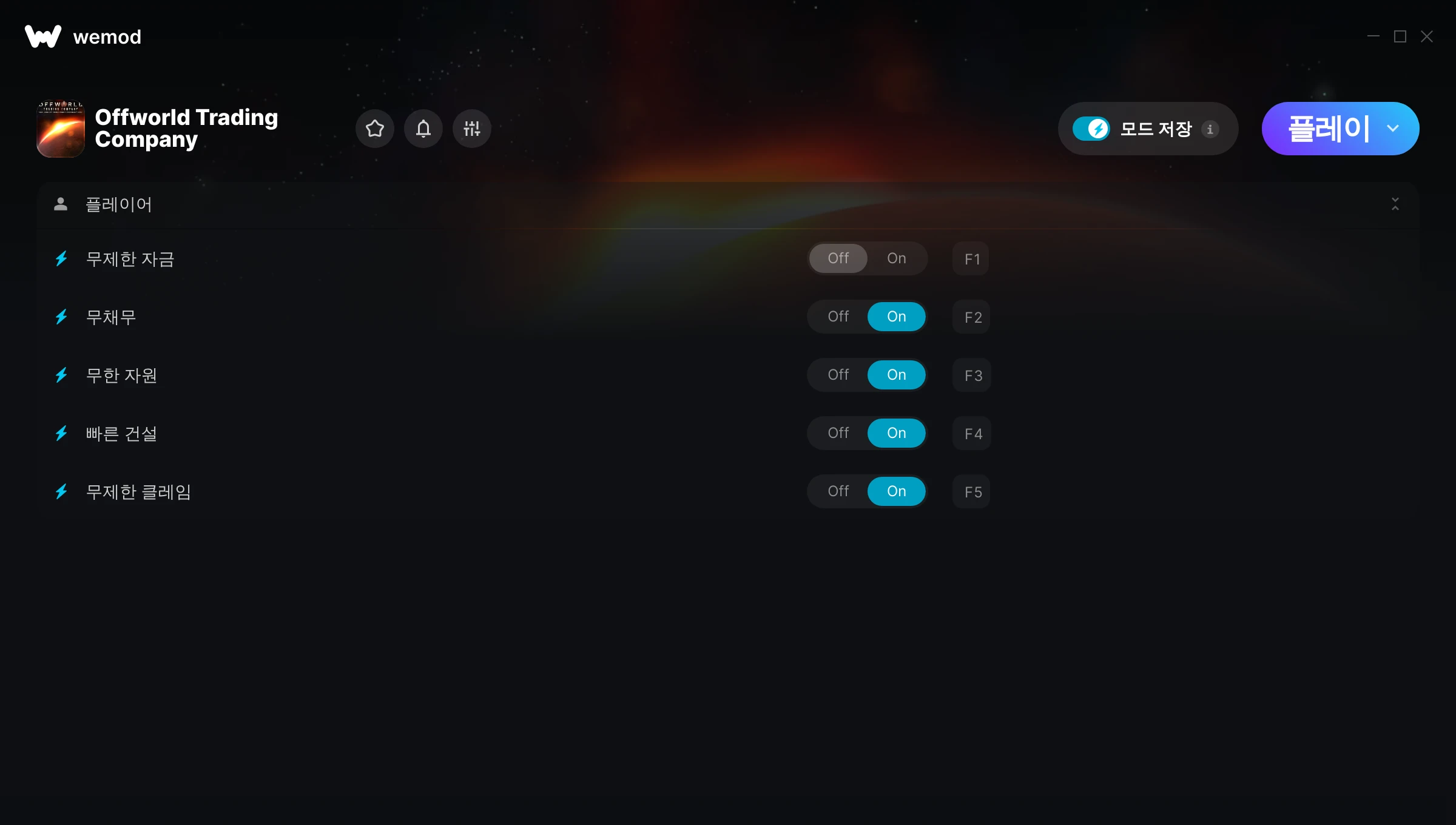 Offworld Trading Company에서 치트를 사용하려면 어떻게 해야 하나요?WeMod는 PC의 모든 게임을 표시합니다. 목록에서 게임을 선택하고 플레이를 누르세요. 게임을 시작하면 다양한 치트를 활성화할 수 있습니다!모드가 제 게임 버전과 호환될까요?WeMod는 고급 기술로 실행 중인 게임 버전을 탐지하고 모드 지원 여부를 표시합니다. 모드가 지원되지 않는다면 모드를 테스트해보거나 업데이트를 요청할 수 있습니다!