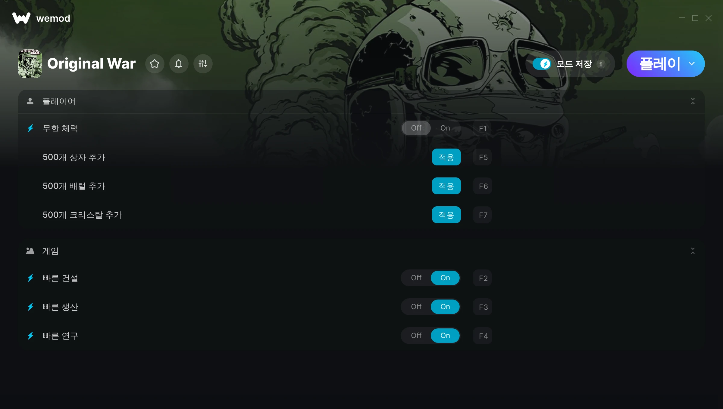Original War에서 치트를 사용하려면 어떻게 해야 하나요?WeMod는 PC의 모든 게임을 표시합니다. 목록에서 게임을 선택하고 플레이를 누르세요. 게임을 시작하면 다양한 치트를 활성화할 수 있습니다!모드가 제 게임 버전과 호환될까요?WeMod는 고급 기술로 실행 중인 게임 버전을 탐지하고 모드 지원 여부를 표시합니다. 모드가 지원되지 않는다면 모드를 테스트해보거나 업데이트를 요청할 수 있습니다!