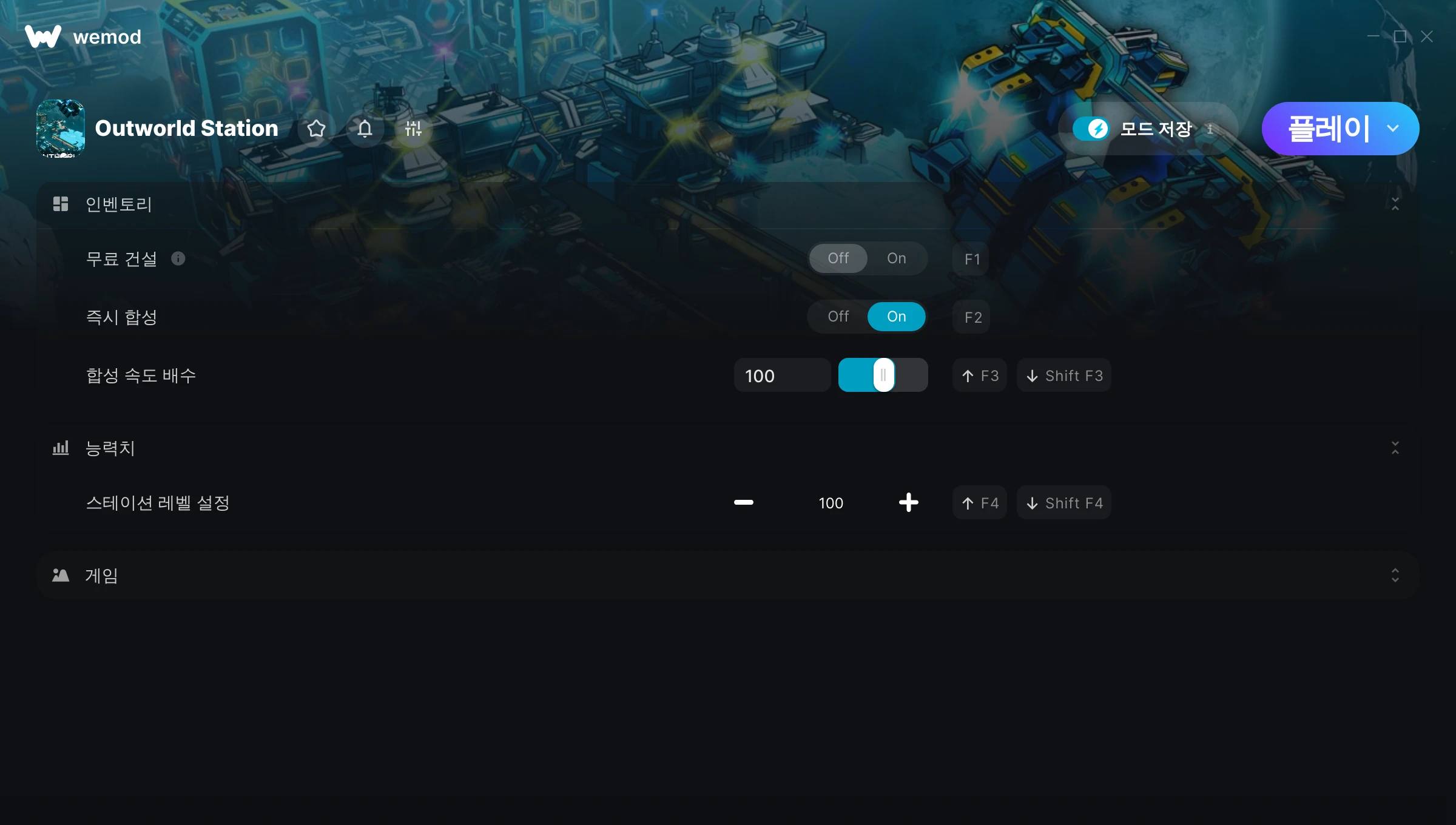 Outworld Station에서 치트를 사용하려면 어떻게 해야 하나요?WeMod는 PC의 모든 게임을 표시합니다. 목록에서 게임을 선택하고 플레이를 누르세요. 게임을 시작하면 다양한 치트를 활성화할 수 있습니다!모드가 제 게임 버전과 호환될까요?WeMod는 고급 기술로 실행 중인 게임 버전을 탐지하고 모드 지원 여부를 표시합니다. 모드가 지원되지 않는다면 모드를 테스트해보거나 업데이트를 요청할 수 있습니다!