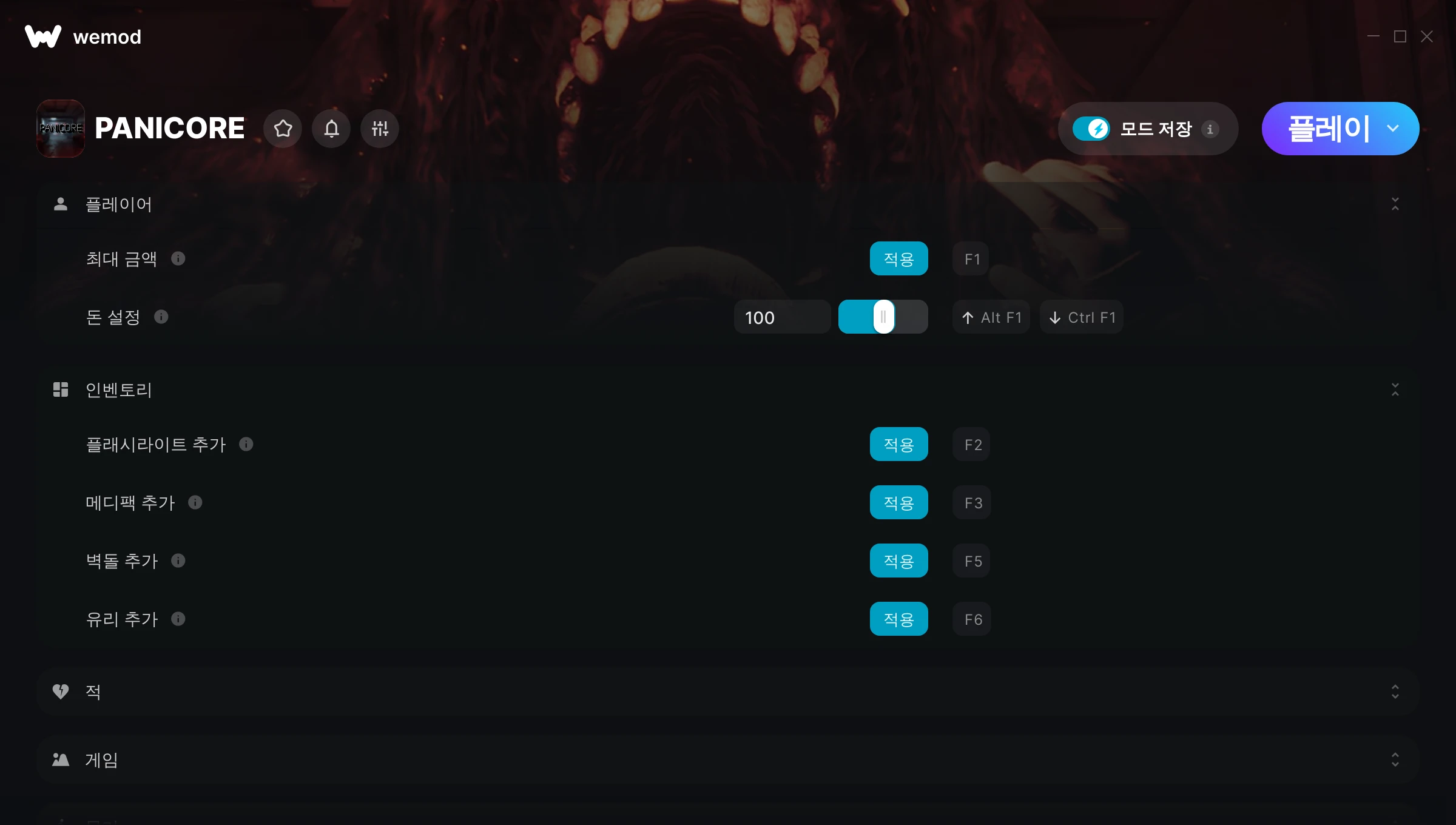PANICORE에서 치트를 사용하려면 어떻게 해야 하나요?WeMod는 PC의 모든 게임을 표시합니다. 목록에서 게임을 선택하고 플레이를 누르세요. 게임을 시작하면 다양한 치트를 활성화할 수 있습니다!모드가 제 게임 버전과 호환될까요?WeMod는 고급 기술로 실행 중인 게임 버전을 탐지하고 모드 지원 여부를 표시합니다. 모드가 지원되지 않는다면 모드를 테스트해보거나 업데이트를 요청할 수 있습니다!