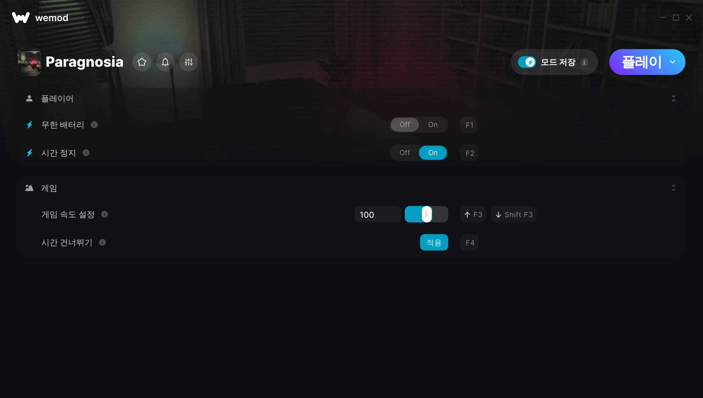 Paragnosia에서 치트를 사용하려면 어떻게 해야 하나요?WeMod는 PC의 모든 게임을 표시합니다. 목록에서 게임을 선택하고 플레이를 누르세요. 게임을 시작하면 다양한 치트를 활성화할 수 있습니다!모드가 제 게임 버전과 호환될까요?WeMod는 고급 기술로 실행 중인 게임 버전을 탐지하고 모드 지원 여부를 표시합니다. 모드가 지원되지 않는다면 모드를 테스트해보거나 업데이트를 요청할 수 있습니다!