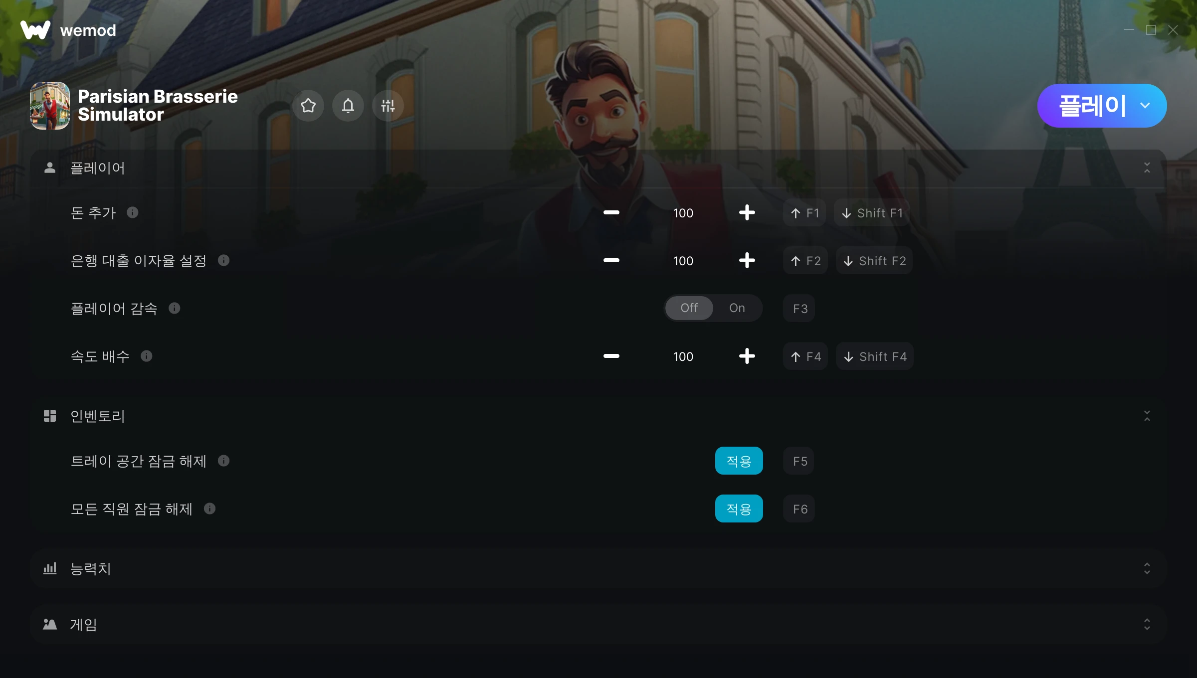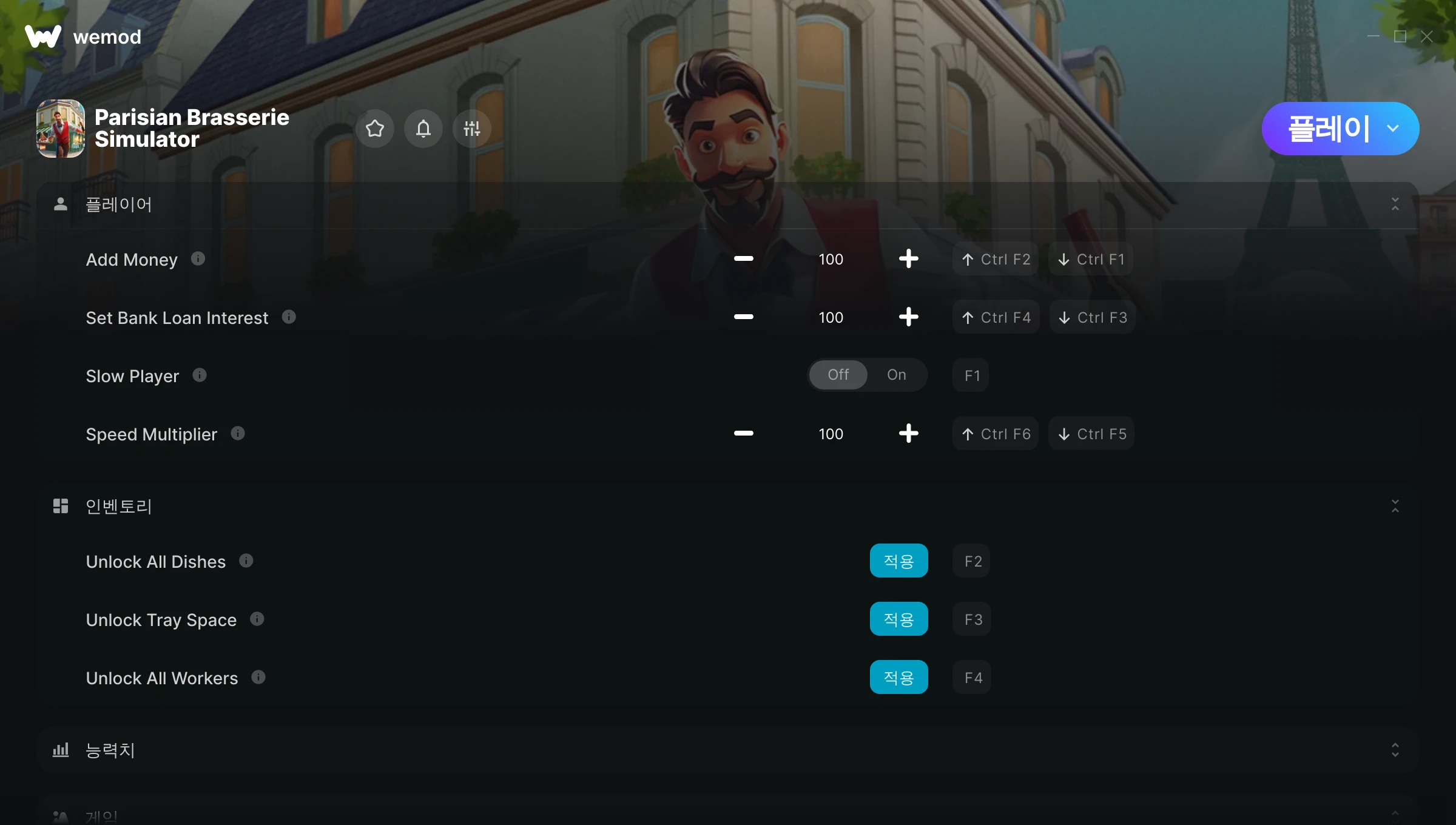 Parisian Brasserie Simulator에서 치트를 사용하려면 어떻게 해야 하나요?WeMod는 PC의 모든 게임을 표시합니다. 목록에서 게임을 선택하고 플레이를 누르세요. 게임을 시작하면 다양한 치트를 활성화할 수 있습니다!모드가 제 게임 버전과 호환될까요?WeMod는 고급 기술로 실행 중인 게임 버전을 탐지하고 모드 지원 여부를 표시합니다. 모드가 지원되지 않는다면 모드를 테스트해보거나 업데이트를 요청할 수 있습니다!