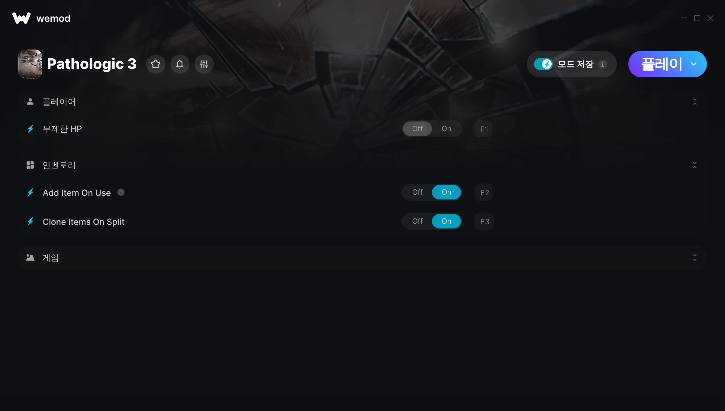 Pathologic 3에서 치트를 사용하려면 어떻게 해야 하나요?WeMod는 PC의 모든 게임을 표시합니다. 목록에서 게임을 선택하고 플레이를 누르세요. 게임을 시작하면 다양한 치트를 활성화할 수 있습니다!모드가 제 게임 버전과 호환될까요?WeMod는 고급 기술로 실행 중인 게임 버전을 탐지하고 모드 지원 여부를 표시합니다. 모드가 지원되지 않는다면 모드를 테스트해보거나 업데이트를 요청할 수 있습니다!