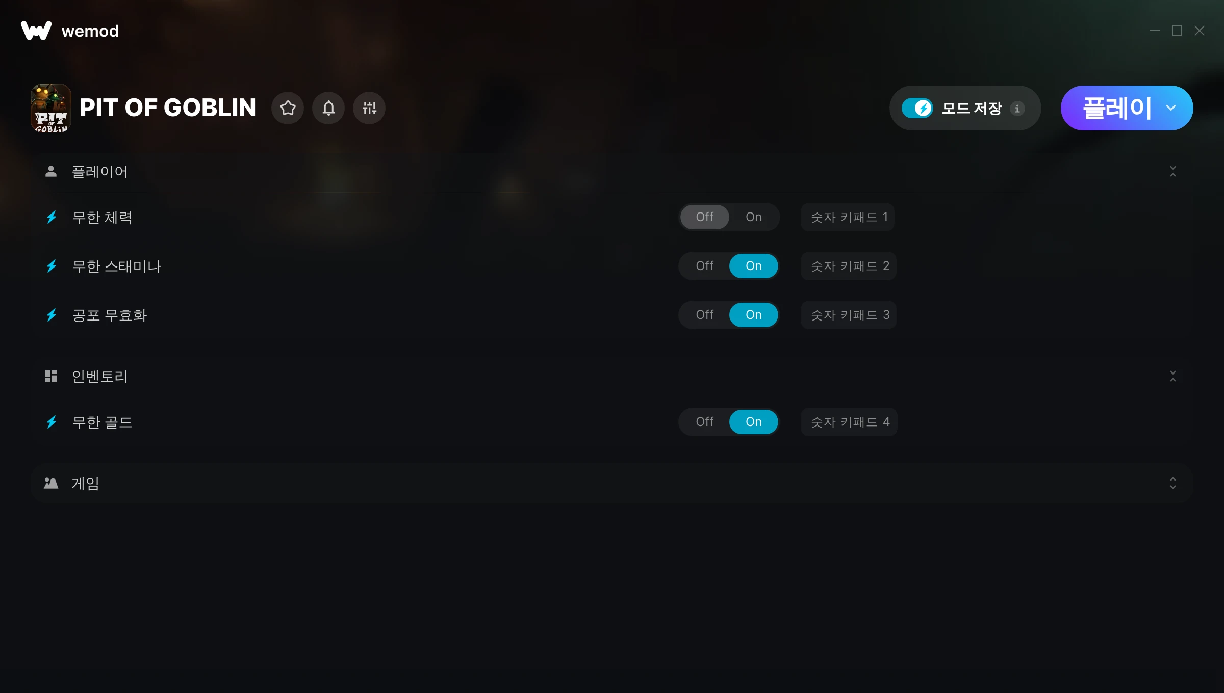 PIT OF GOBLIN에서 치트를 사용하려면 어떻게 해야 하나요?WeMod는 PC의 모든 게임을 표시합니다. 목록에서 게임을 선택하고 플레이를 누르세요. 게임을 시작하면 다양한 치트를 활성화할 수 있습니다!모드가 제 게임 버전과 호환될까요?WeMod는 고급 기술로 실행 중인 게임 버전을 탐지하고 모드 지원 여부를 표시합니다. 모드가 지원되지 않는다면 모드를 테스트해보거나 업데이트를 요청할 수 있습니다!