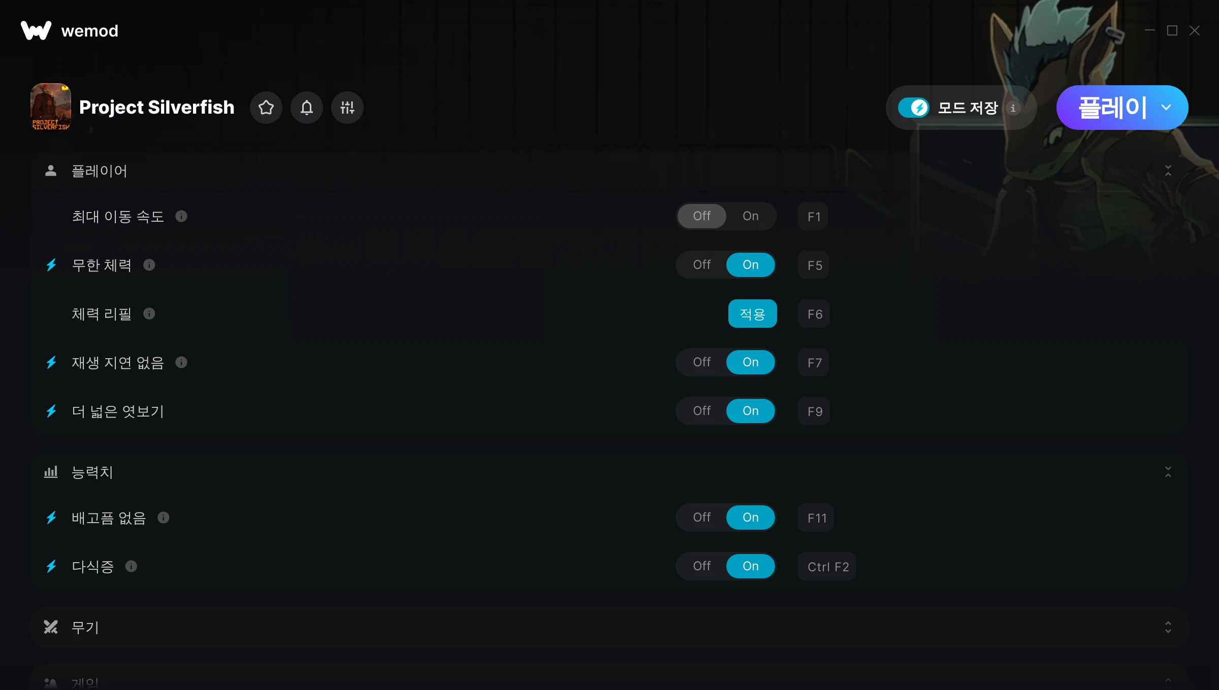 Project Silverfish에서 치트를 사용하려면 어떻게 해야 하나요?WeMod는 PC의 모든 게임을 표시합니다. 목록에서 게임을 선택하고 플레이를 누르세요. 게임을 시작하면 다양한 치트를 활성화할 수 있습니다!모드가 제 게임 버전과 호환될까요?WeMod는 고급 기술로 실행 중인 게임 버전을 탐지하고 모드 지원 여부를 표시합니다. 모드가 지원되지 않는다면 모드를 테스트해보거나 업데이트를 요청할 수 있습니다!