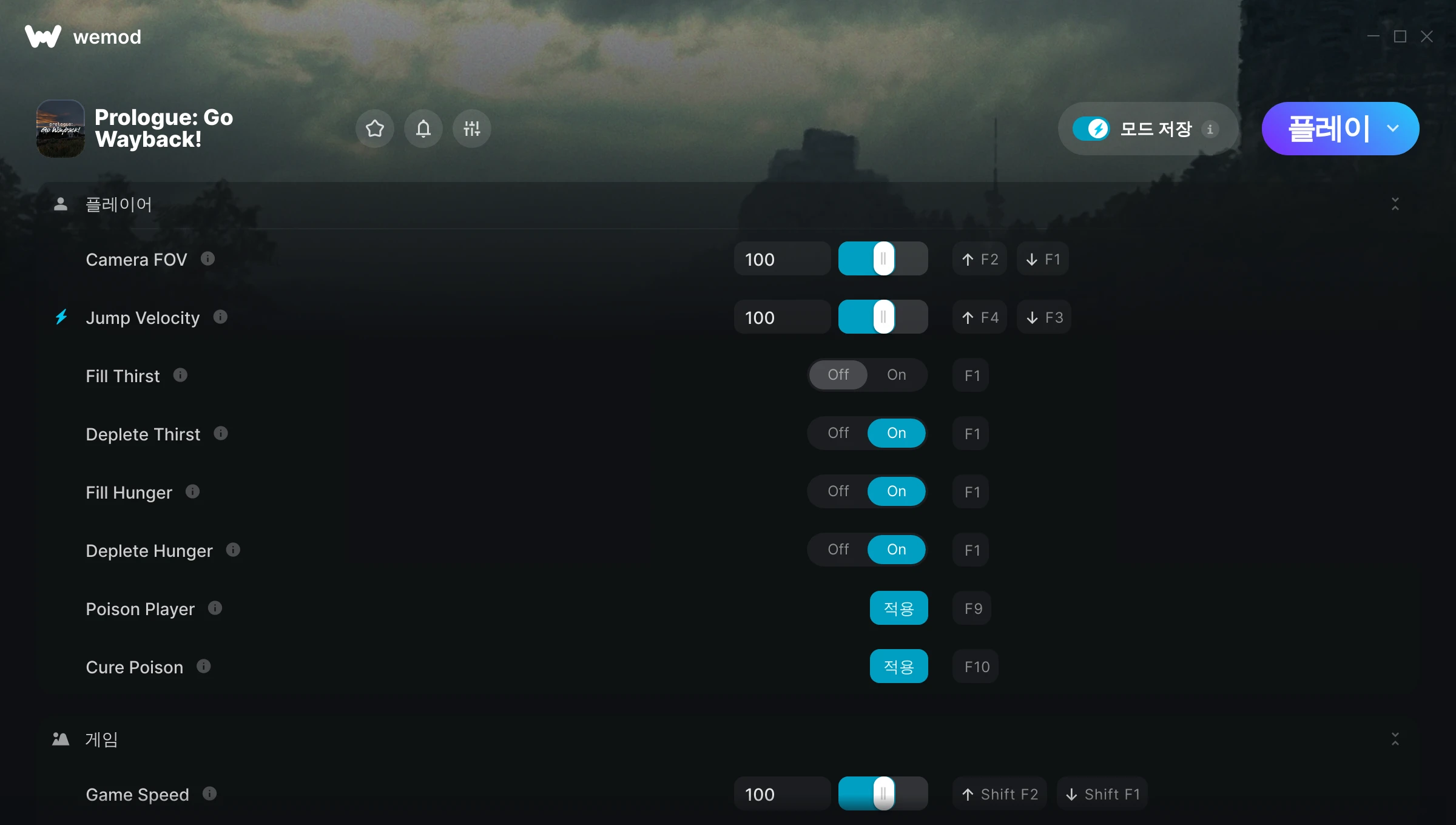 Prologue: Go Wayback!에서 치트를 사용하려면 어떻게 해야 하나요?WeMod는 PC의 모든 게임을 표시합니다. 목록에서 게임을 선택하고 플레이를 누르세요. 게임을 시작하면 다양한 치트를 활성화할 수 있습니다!모드가 제 게임 버전과 호환될까요?WeMod는 고급 기술로 실행 중인 게임 버전을 탐지하고 모드 지원 여부를 표시합니다. 모드가 지원되지 않는다면 모드를 테스트해보거나 업데이트를 요청할 수 있습니다!