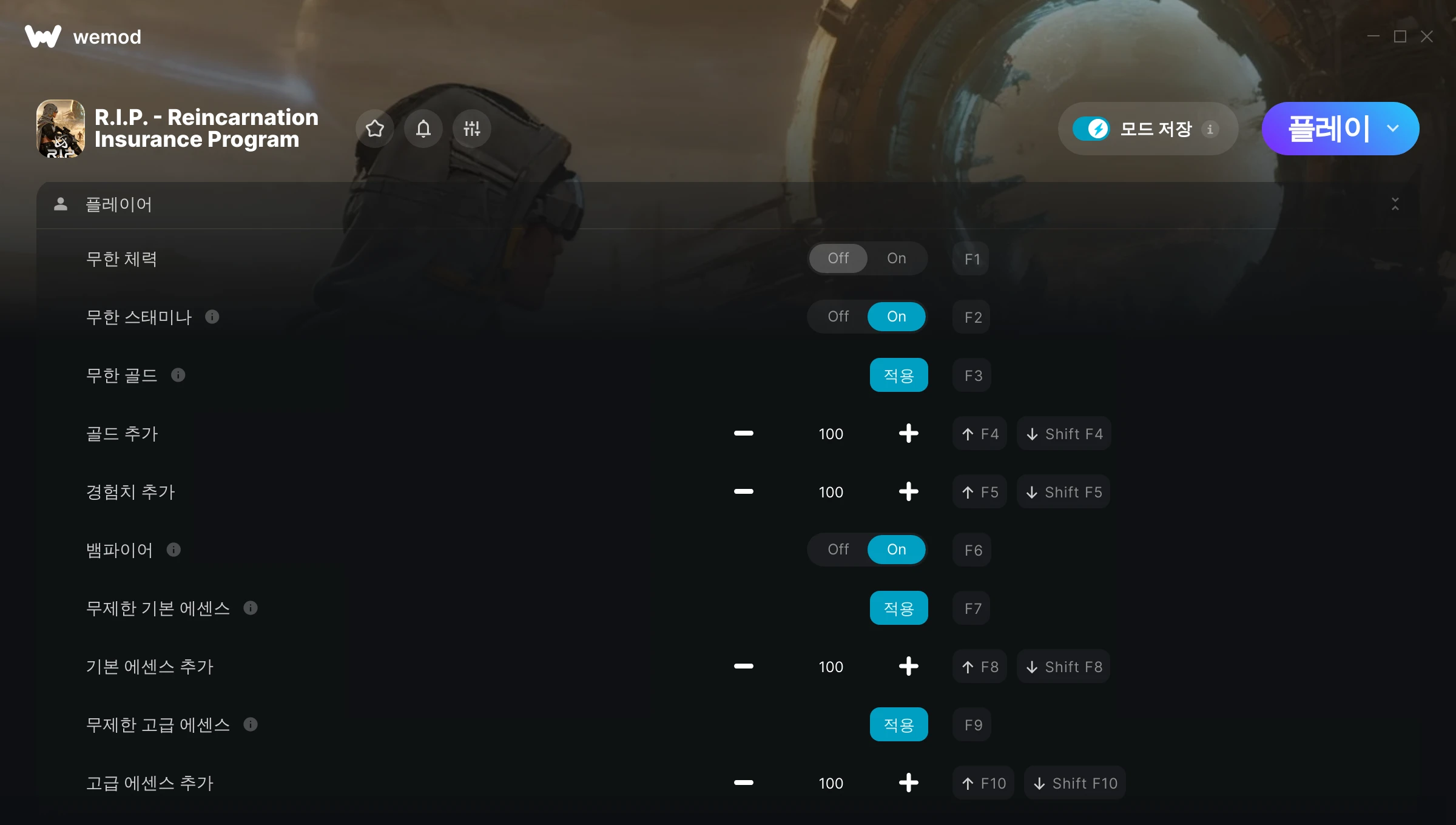 R.I.P. - Reincarnation Insurance Program에서 치트를 사용하려면 어떻게 해야 하나요?WeMod는 PC의 모든 게임을 표시합니다. 목록에서 게임을 선택하고 플레이를 누르세요. 게임을 시작하면 다양한 치트를 활성화할 수 있습니다!모드가 제 게임 버전과 호환될까요?WeMod는 고급 기술로 실행 중인 게임 버전을 탐지하고 모드 지원 여부를 표시합니다. 모드가 지원되지 않는다면 모드를 테스트해보거나 업데이트를 요청할 수 있습니다!