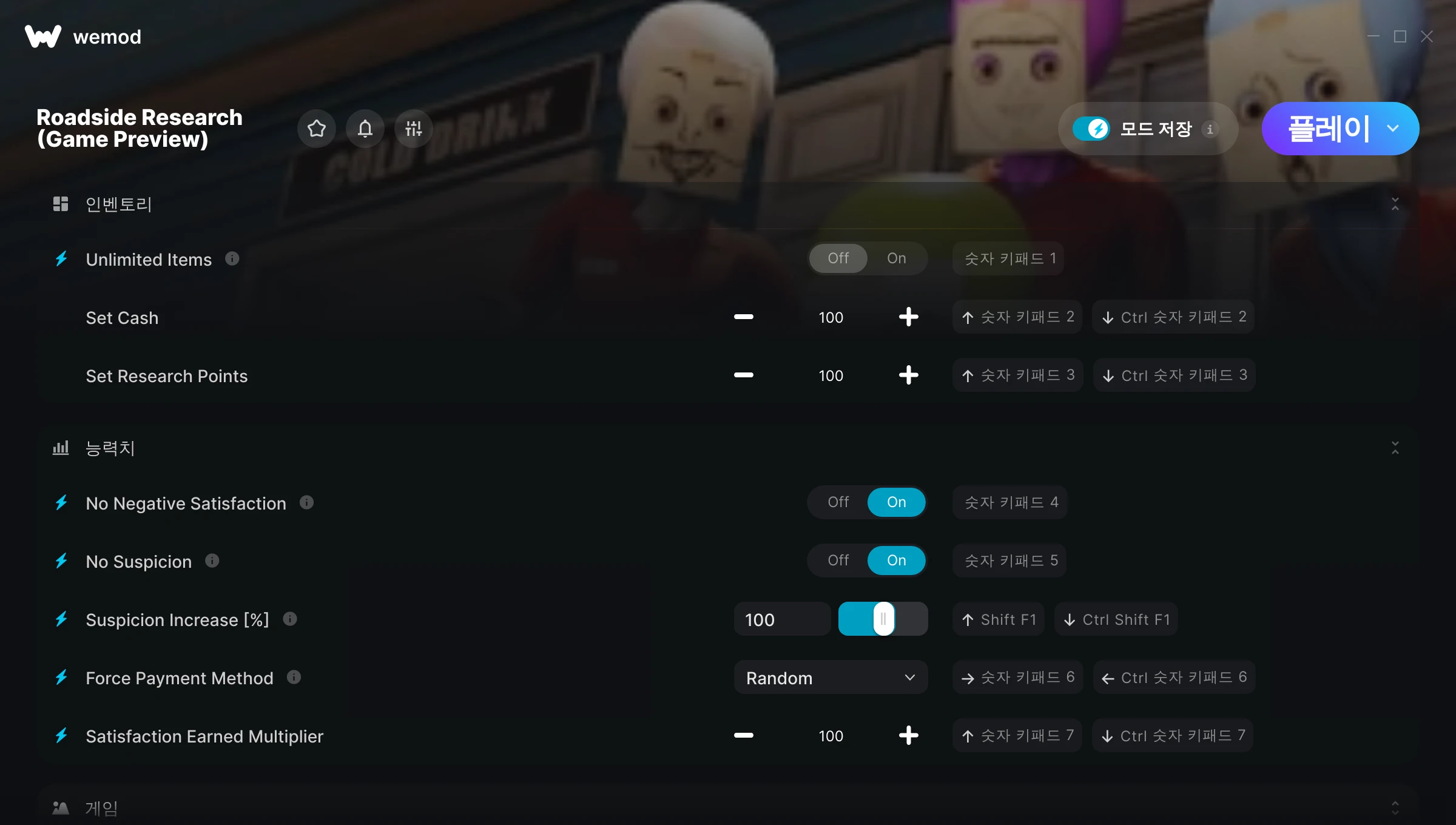 Roadside Research (Game Preview)에서 치트를 사용하려면 어떻게 해야 하나요?WeMod는 PC의 모든 게임을 표시합니다. 목록에서 게임을 선택하고 플레이를 누르세요. 게임을 시작하면 다양한 치트를 활성화할 수 있습니다!모드가 제 게임 버전과 호환될까요?WeMod는 고급 기술로 실행 중인 게임 버전을 탐지하고 모드 지원 여부를 표시합니다. 모드가 지원되지 않는다면 모드를 테스트해보거나 업데이트를 요청할 수 있습니다!