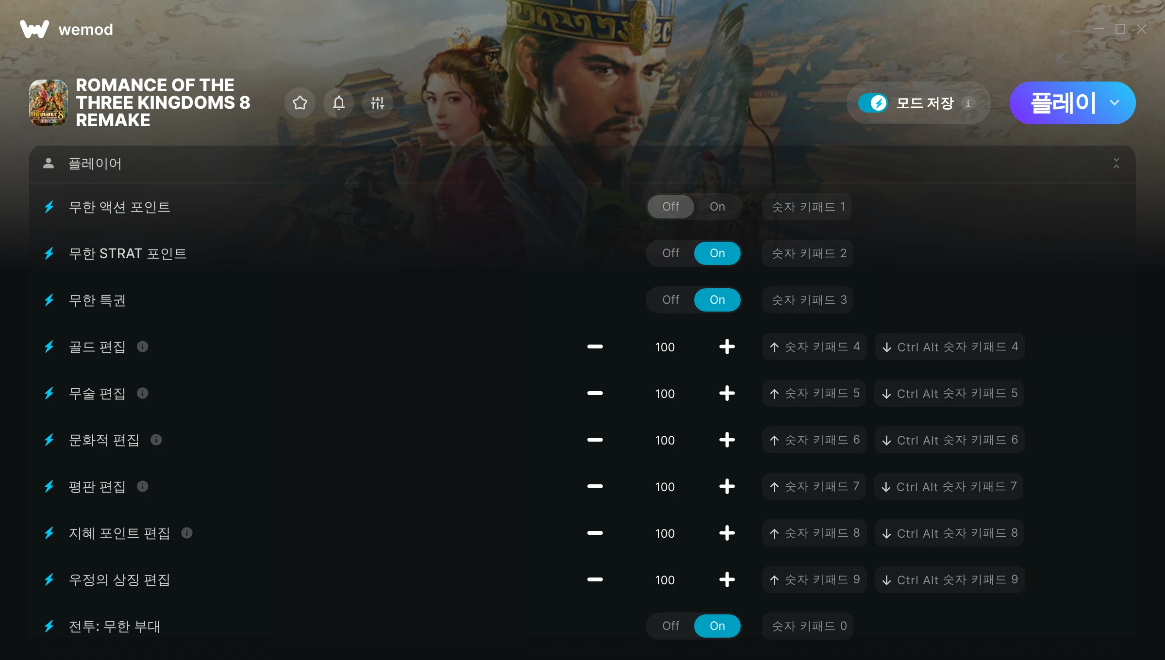 ROMANCE OF THE THREE KINGDOMS 8 REMAKE에서 치트를 사용하려면 어떻게 해야 하나요?WeMod는 PC의 모든 게임을 표시합니다. 목록에서 게임을 선택하고 플레이를 누르세요. 게임을 시작하면 다양한 치트를 활성화할 수 있습니다!모드가 제 게임 버전과 호환될까요?WeMod는 고급 기술로 실행 중인 게임 버전을 탐지하고 모드 지원 여부를 표시합니다. 모드가 지원되지 않는다면 모드를 테스트해보거나 업데이트를 요청할 수 있습니다!