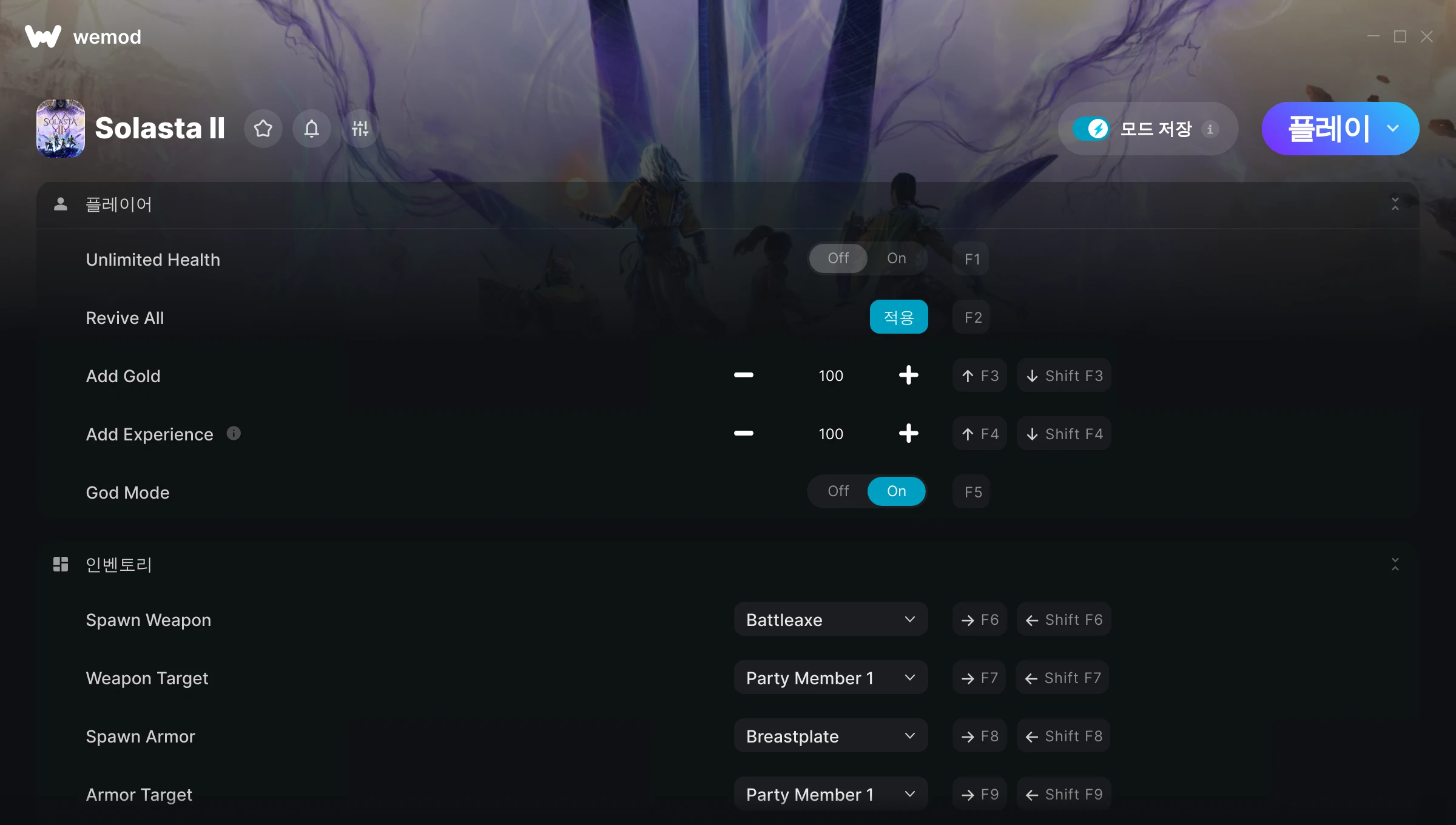 Solasta II에서 치트를 사용하려면 어떻게 해야 하나요?WeMod는 PC의 모든 게임을 표시합니다. 목록에서 게임을 선택하고 플레이를 누르세요. 게임을 시작하면 다양한 치트를 활성화할 수 있습니다!모드가 제 게임 버전과 호환될까요?WeMod는 고급 기술로 실행 중인 게임 버전을 탐지하고 모드 지원 여부를 표시합니다. 모드가 지원되지 않는다면 모드를 테스트해보거나 업데이트를 요청할 수 있습니다!