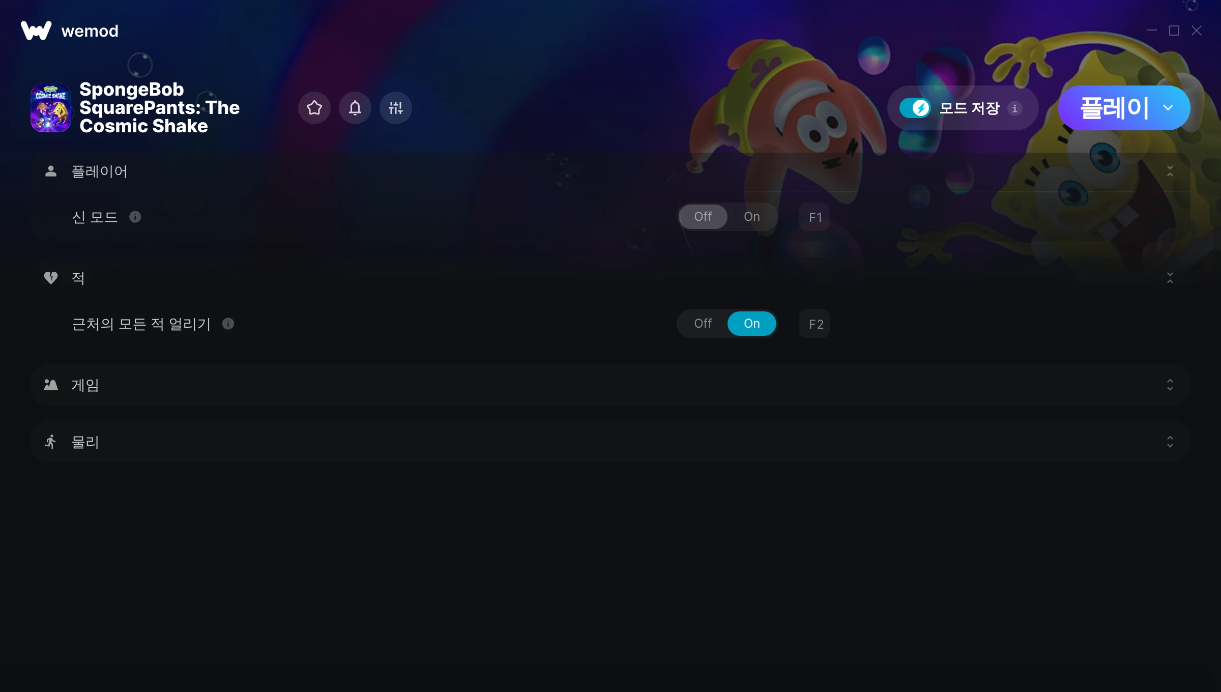 85MB Windows ...또는 PC에서 WeMod를 방문해 앱을 다운로드할 수도 있습니다 신 모드 받기, 근처의 모든 적 얼리기 & 11개의 다른 모드 for SpongeBob SquarePants: The Cosmic Shake with WeMod