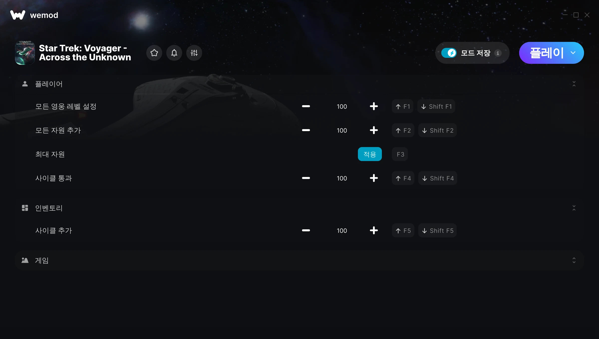 Star Trek: Voyager - Across the Unknown에서 치트를 사용하려면 어떻게 해야 하나요?WeMod는 PC의 모든 게임을 표시합니다. 목록에서 게임을 선택하고 플레이를 누르세요. 게임을 시작하면 다양한 치트를 활성화할 수 있습니다!모드가 제 게임 버전과 호환될까요?WeMod는 고급 기술로 실행 중인 게임 버전을 탐지하고 모드 지원 여부를 표시합니다. 모드가 지원되지 않는다면 모드를 테스트해보거나 업데이트를 요청할 수 있습니다!