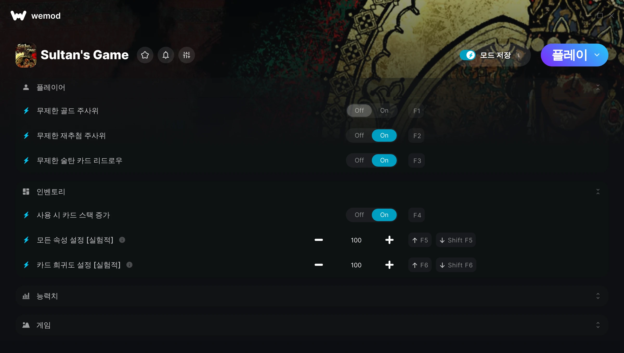 Sultan's Game에서 치트를 사용하려면 어떻게 해야 하나요?WeMod는 PC의 모든 게임을 표시합니다. 목록에서 게임을 선택하고 플레이를 누르세요. 게임을 시작하면 다양한 치트를 활성화할 수 있습니다!모드가 제 게임 버전과 호환될까요?WeMod는 고급 기술로 실행 중인 게임 버전을 탐지하고 모드 지원 여부를 표시합니다. 모드가 지원되지 않는다면 모드를 테스트해보거나 업데이트를 요청할 수 있습니다!
