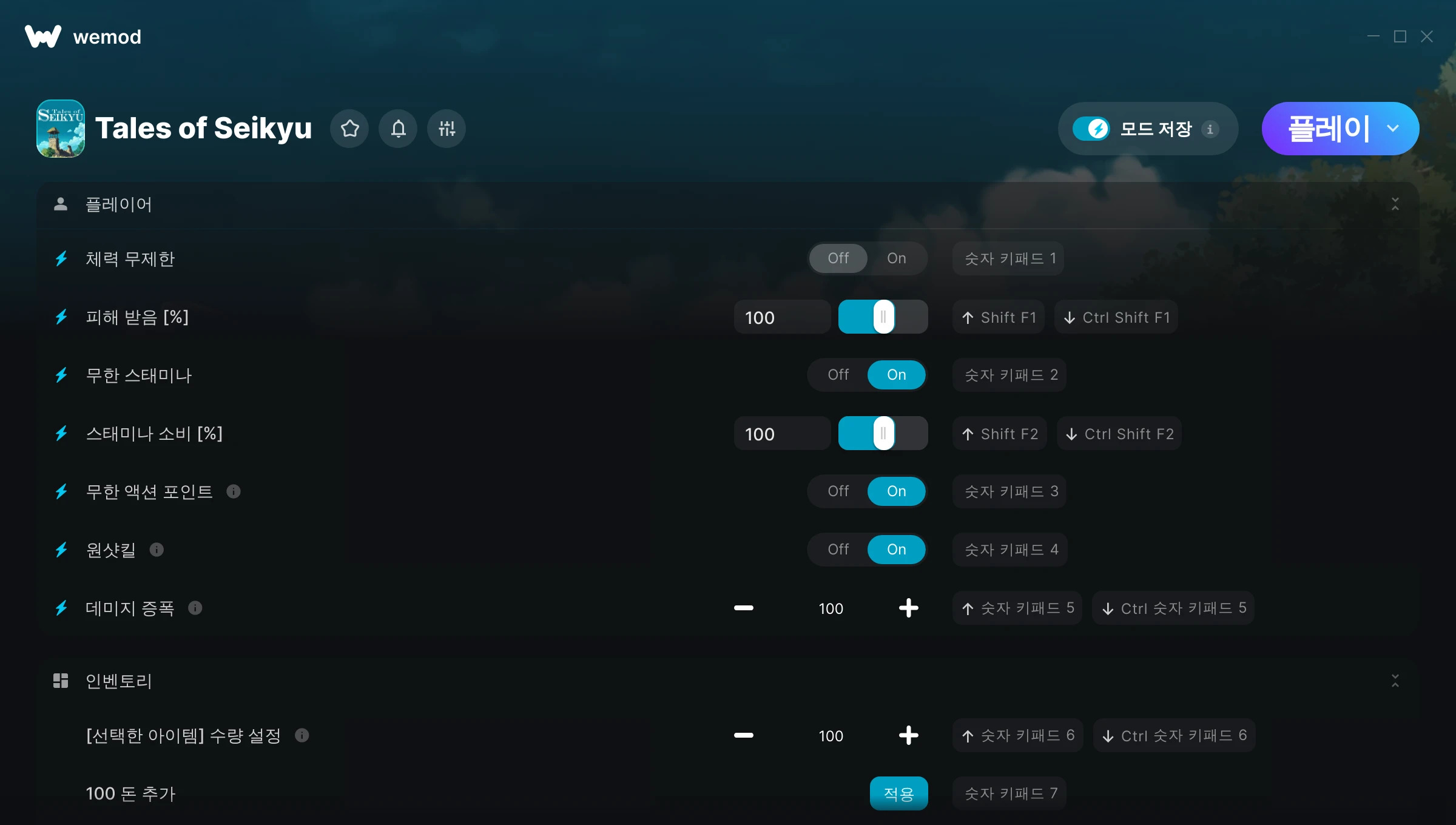Tales of Seikyu에서 치트를 사용하려면 어떻게 해야 하나요?WeMod는 PC의 모든 게임을 표시합니다. 목록에서 게임을 선택하고 플레이를 누르세요. 게임을 시작하면 다양한 치트를 활성화할 수 있습니다!모드가 제 게임 버전과 호환될까요?WeMod는 고급 기술로 실행 중인 게임 버전을 탐지하고 모드 지원 여부를 표시합니다. 모드가 지원되지 않는다면 모드를 테스트해보거나 업데이트를 요청할 수 있습니다!