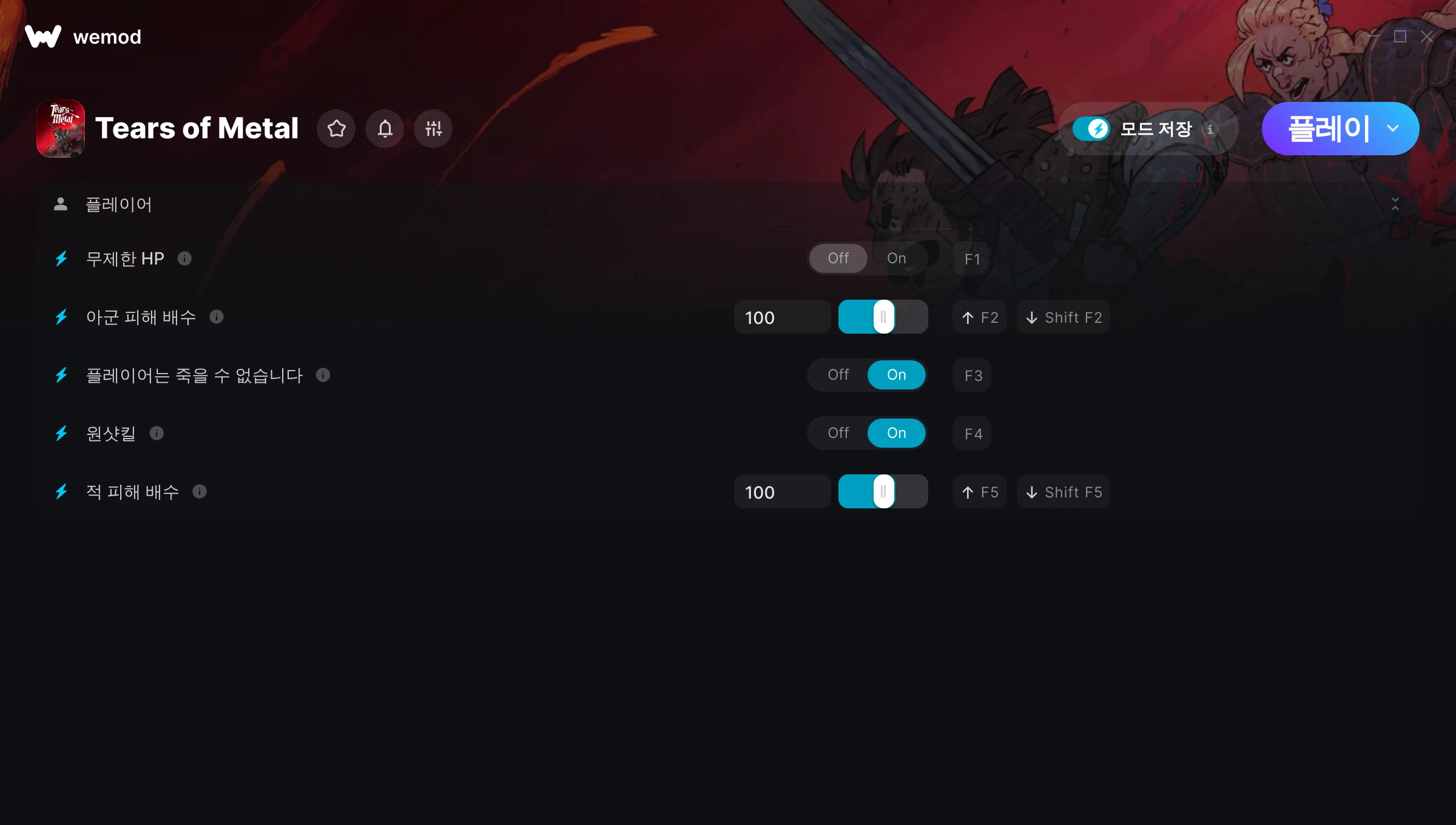 Tears of Metal에서 치트를 사용하려면 어떻게 해야 하나요?WeMod는 PC의 모든 게임을 표시합니다. 목록에서 게임을 선택하고 플레이를 누르세요. 게임을 시작하면 다양한 치트를 활성화할 수 있습니다!모드가 제 게임 버전과 호환될까요?WeMod는 고급 기술로 실행 중인 게임 버전을 탐지하고 모드 지원 여부를 표시합니다. 모드가 지원되지 않는다면 모드를 테스트해보거나 업데이트를 요청할 수 있습니다!