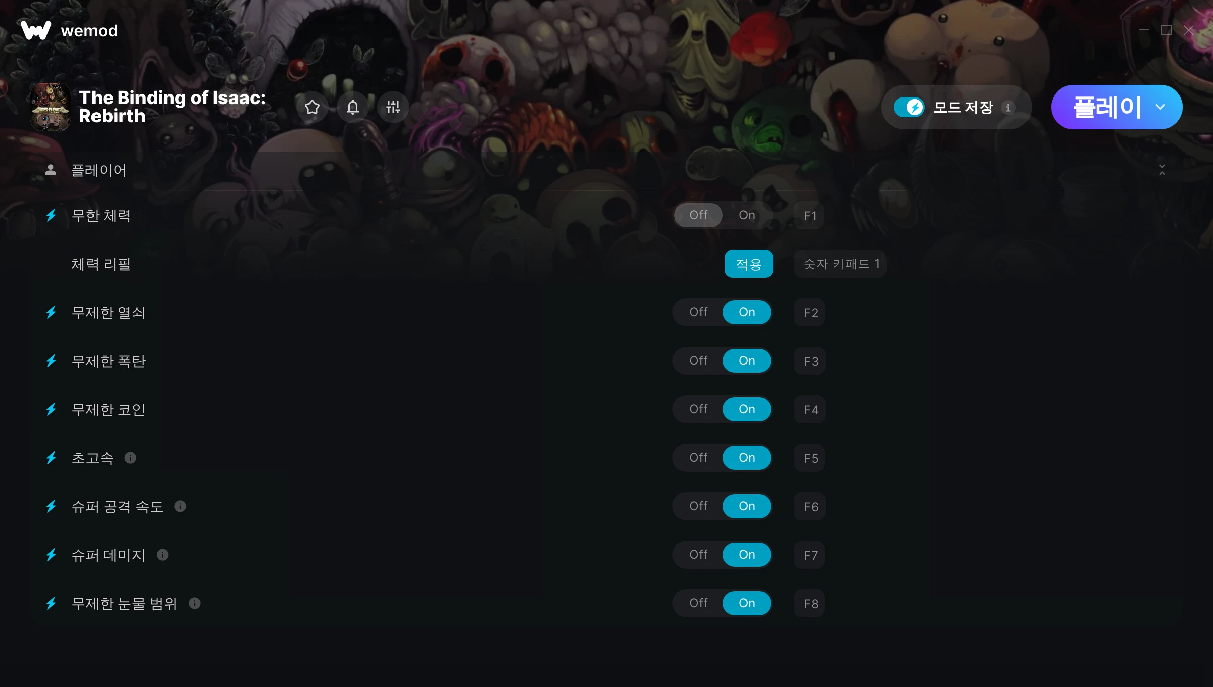 its funky i have to load the game through steam wait till is fully opens then press play in wemod. the health works and items. the damage and speed and tears works when i press escape when im in a game.