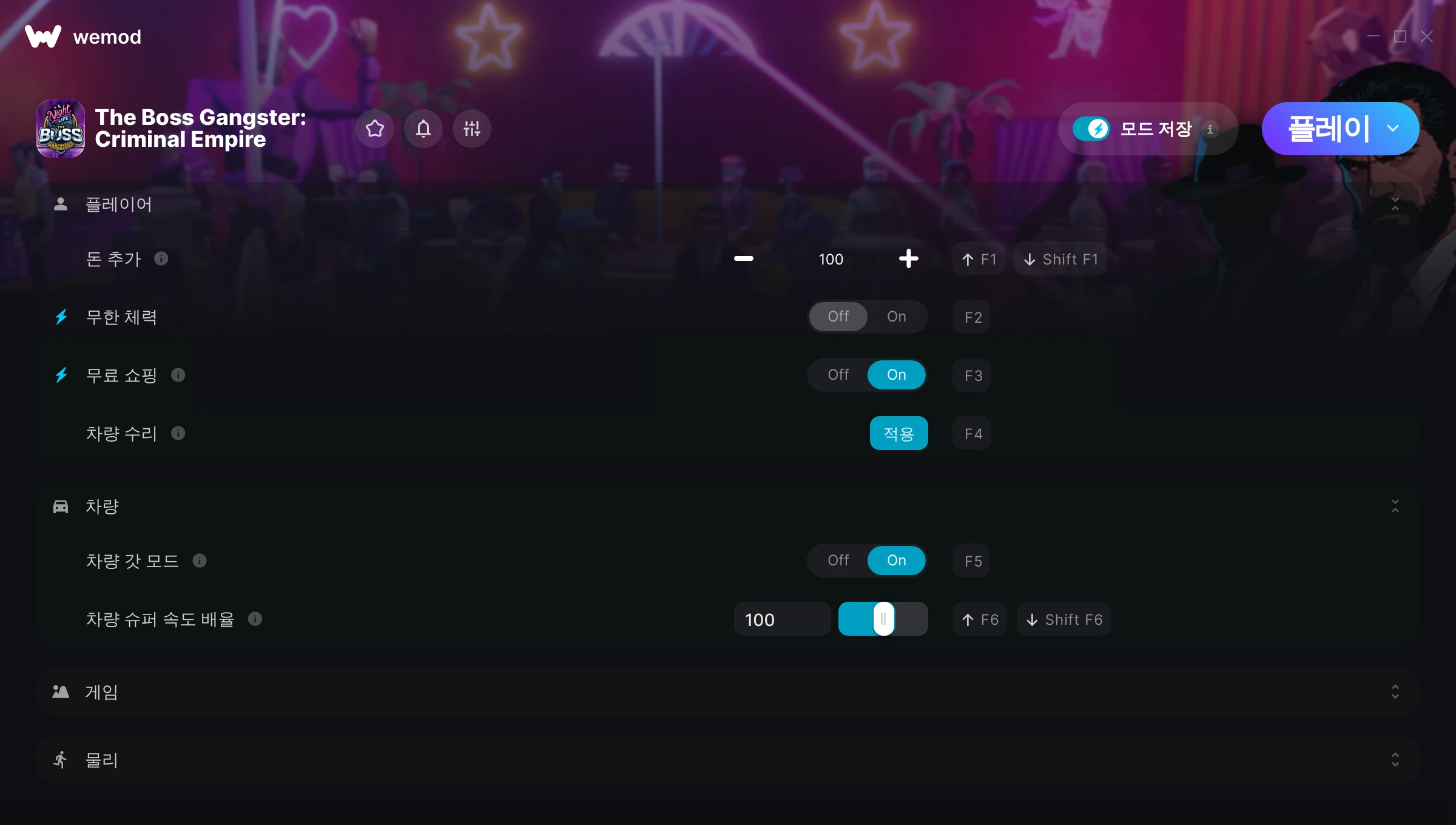 The Boss Gangster: Criminal Empire에서 치트를 사용하려면 어떻게 해야 하나요?WeMod는 PC의 모든 게임을 표시합니다. 목록에서 게임을 선택하고 플레이를 누르세요. 게임을 시작하면 다양한 치트를 활성화할 수 있습니다!모드가 제 게임 버전과 호환될까요?WeMod는 고급 기술로 실행 중인 게임 버전을 탐지하고 모드 지원 여부를 표시합니다. 모드가 지원되지 않는다면 모드를 테스트해보거나 업데이트를 요청할 수 있습니다!
