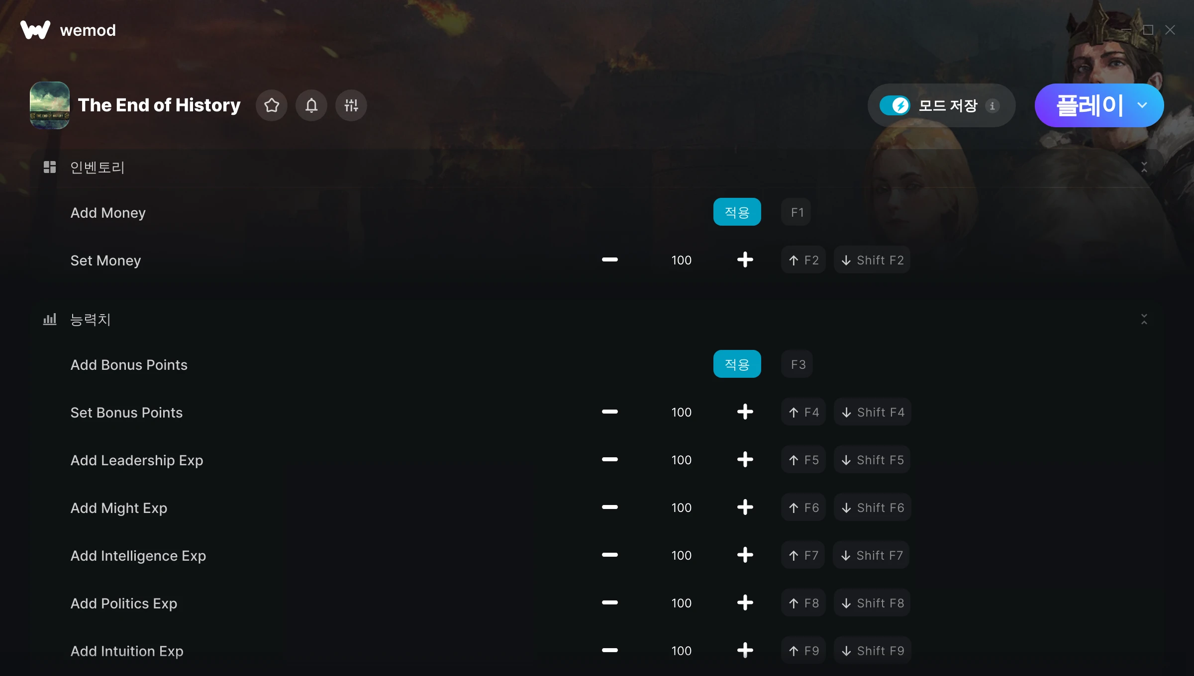 The End of History에서 치트를 사용하려면 어떻게 해야 하나요?WeMod는 PC의 모든 게임을 표시합니다. 목록에서 게임을 선택하고 플레이를 누르세요. 게임을 시작하면 다양한 치트를 활성화할 수 있습니다!모드가 제 게임 버전과 호환될까요?WeMod는 고급 기술로 실행 중인 게임 버전을 탐지하고 모드 지원 여부를 표시합니다. 모드가 지원되지 않는다면 모드를 테스트해보거나 업데이트를 요청할 수 있습니다!