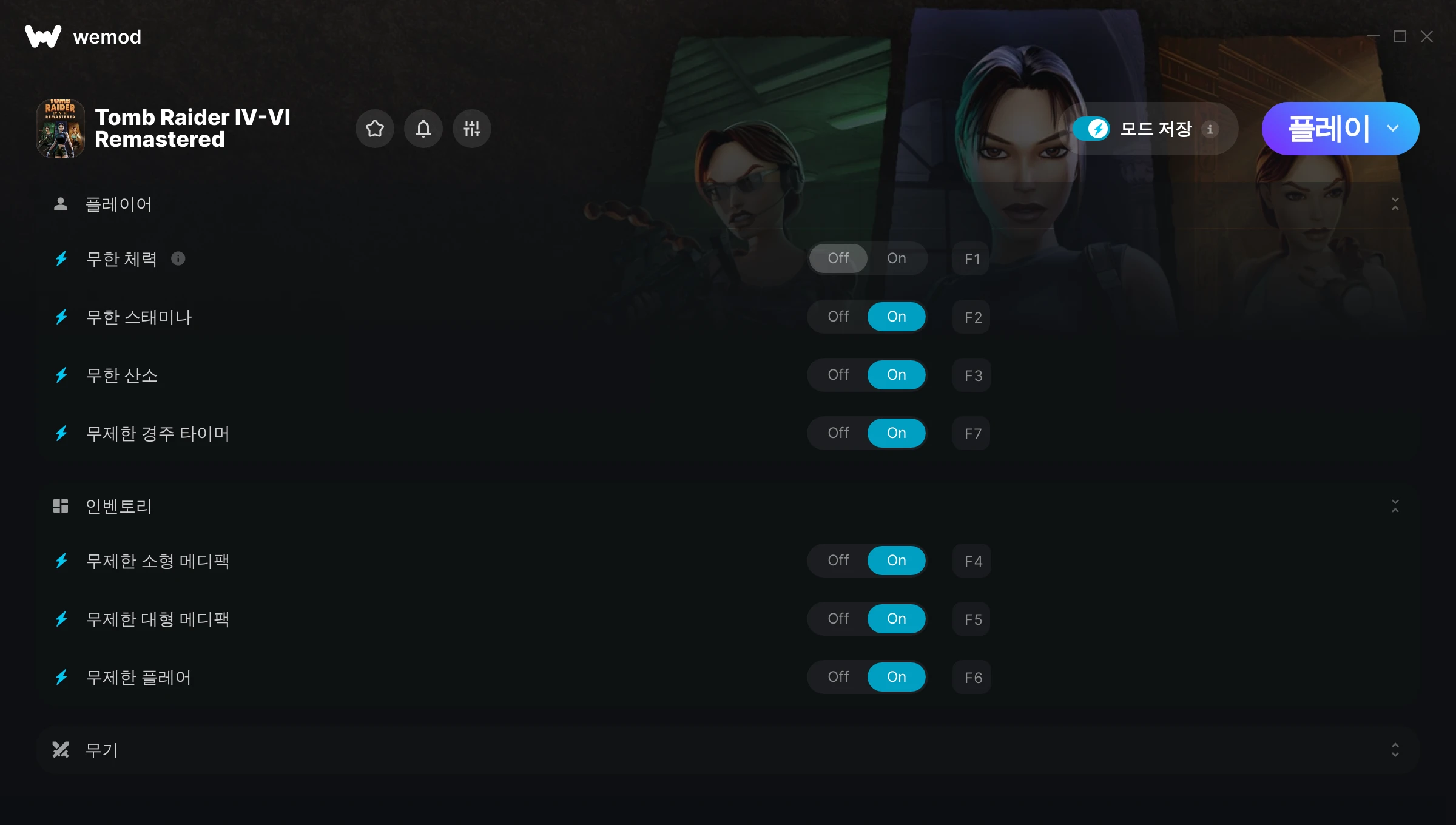 Tomb Raider IV-VI Remastered에서 치트를 사용하려면 어떻게 해야 하나요?WeMod는 PC의 모든 게임을 표시합니다. 목록에서 게임을 선택하고 플레이를 누르세요. 게임을 시작하면 다양한 치트를 활성화할 수 있습니다!모드가 제 게임 버전과 호환될까요?WeMod는 고급 기술로 실행 중인 게임 버전을 탐지하고 모드 지원 여부를 표시합니다. 모드가 지원되지 않는다면 모드를 테스트해보거나 업데이트를 요청할 수 있습니다!
