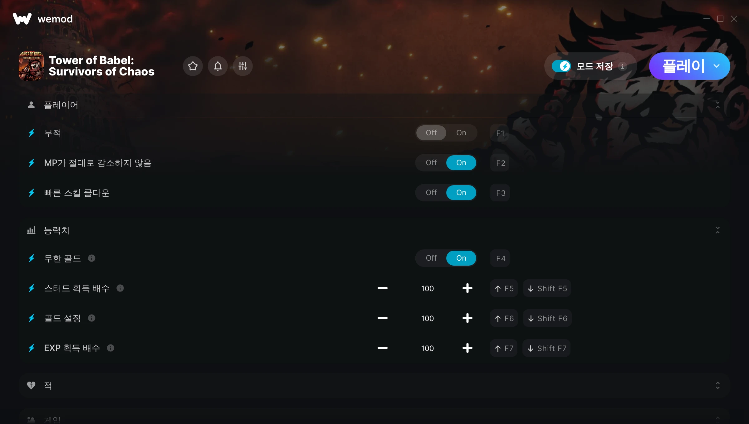 Tower of Babel: Survivors of Chaos에서 치트를 사용하려면 어떻게 해야 하나요?WeMod는 PC의 모든 게임을 표시합니다. 목록에서 게임을 선택하고 플레이를 누르세요. 게임을 시작하면 다양한 치트를 활성화할 수 있습니다!모드가 제 게임 버전과 호환될까요?WeMod는 고급 기술로 실행 중인 게임 버전을 탐지하고 모드 지원 여부를 표시합니다. 모드가 지원되지 않는다면 모드를 테스트해보거나 업데이트를 요청할 수 있습니다!